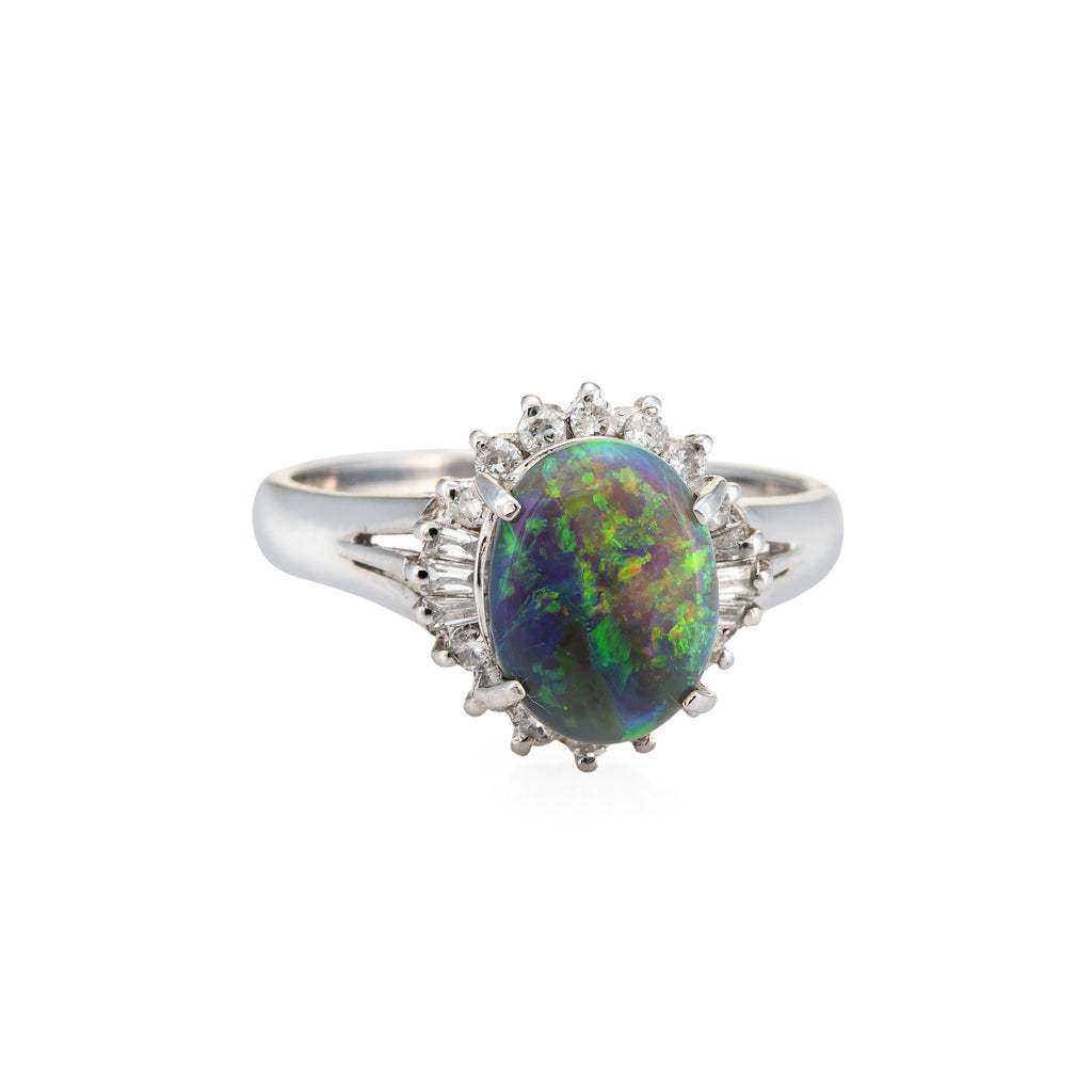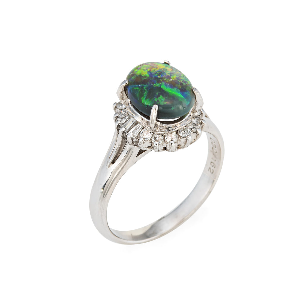 Stones: Cabochon cut oval natural black opal measures 9.5mm x 7mm (1.62 carats). Mixed cut diamonds (baguette & round brilliant cuts) total an estimated 0.30 carats (estimated at I-J color and SI2-I2 clarity). The opal is in very good condition and free of cracks or chips.