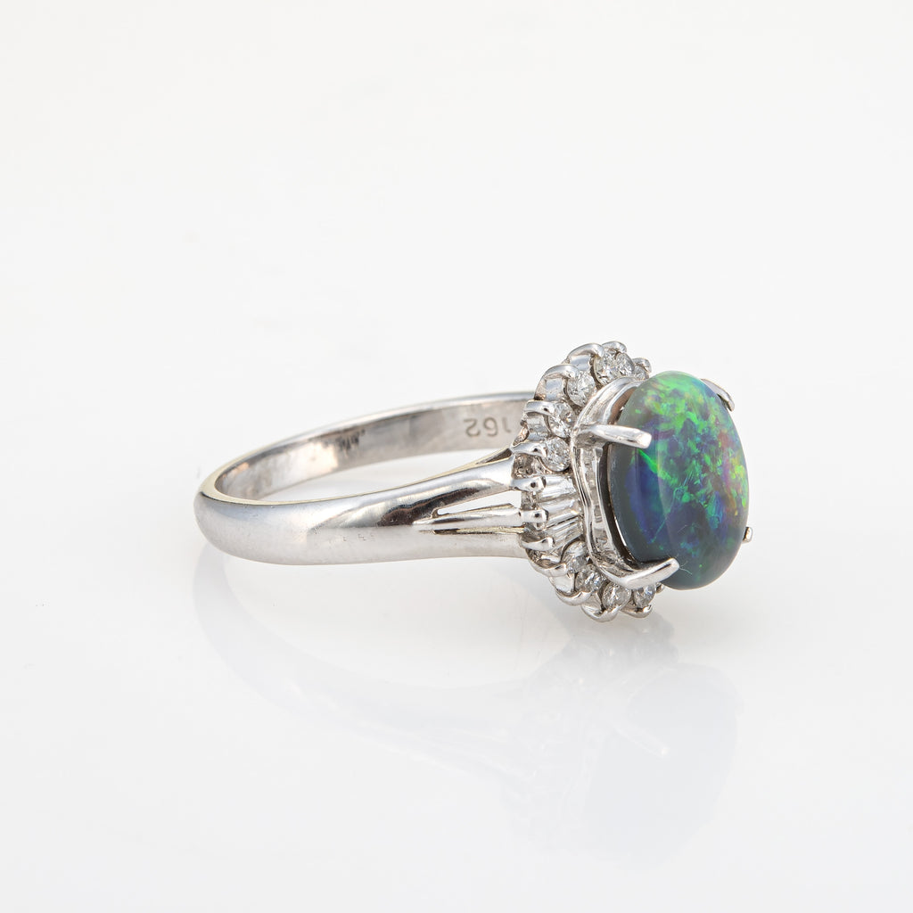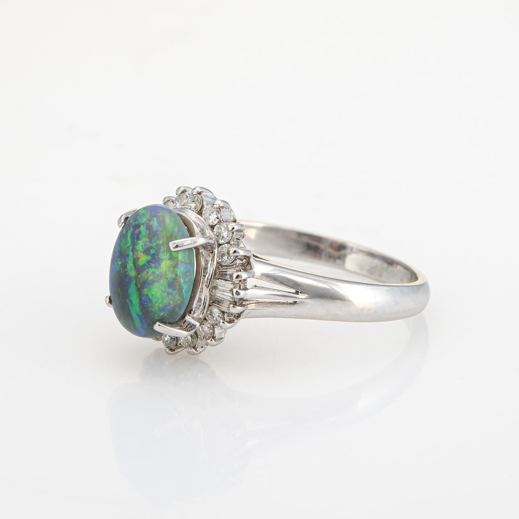 Cabochon cut oval natural black opal measures 9.5mm x 7mm (1.62 carats). Mixed cut diamonds (baguette & round brilliant cuts) total an estimated 0.30 carats (estimated at I-J color and SI2-I2 clarity). The opal is in very good condition and free of cracks or chips.