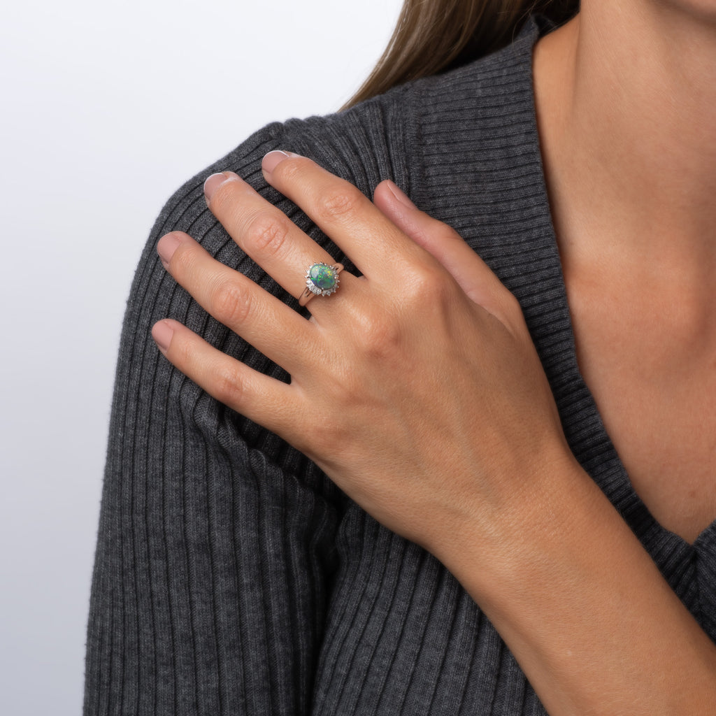 The natural black opal is Australian in origin with color flashes that cross the color spectrum. The opal shows vivid green color flashes with hints of vivid blue, purple and turquoise. It lights up beautifully in natural sunlight (opals are hard to photograph & the vivid color flashes were not captured in the images!) The cocktail is smaller in scale and makes a nice statement on the hand. The medium rise ring (8.5mm - 0.33 inches) sits comfortably on the finger.