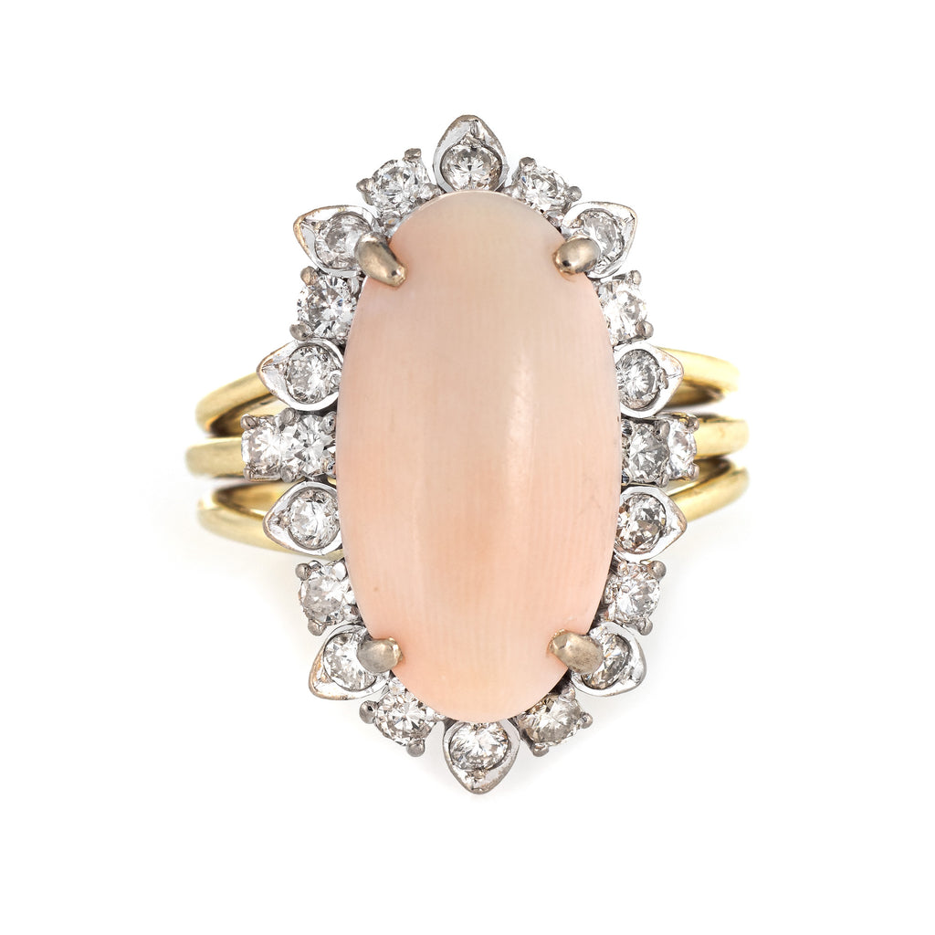 Angel skin coral is cabochon cut measuring 17mm x 9mm (estimated at 4.50 carats), accented with 23 estimated 0.02 carat diamonds. The total diamond weight is estimated at 0.46 carats (estimated at J-K color and SI1-I1 clarity). The coral is in excellent condition and free of cracks or chips.