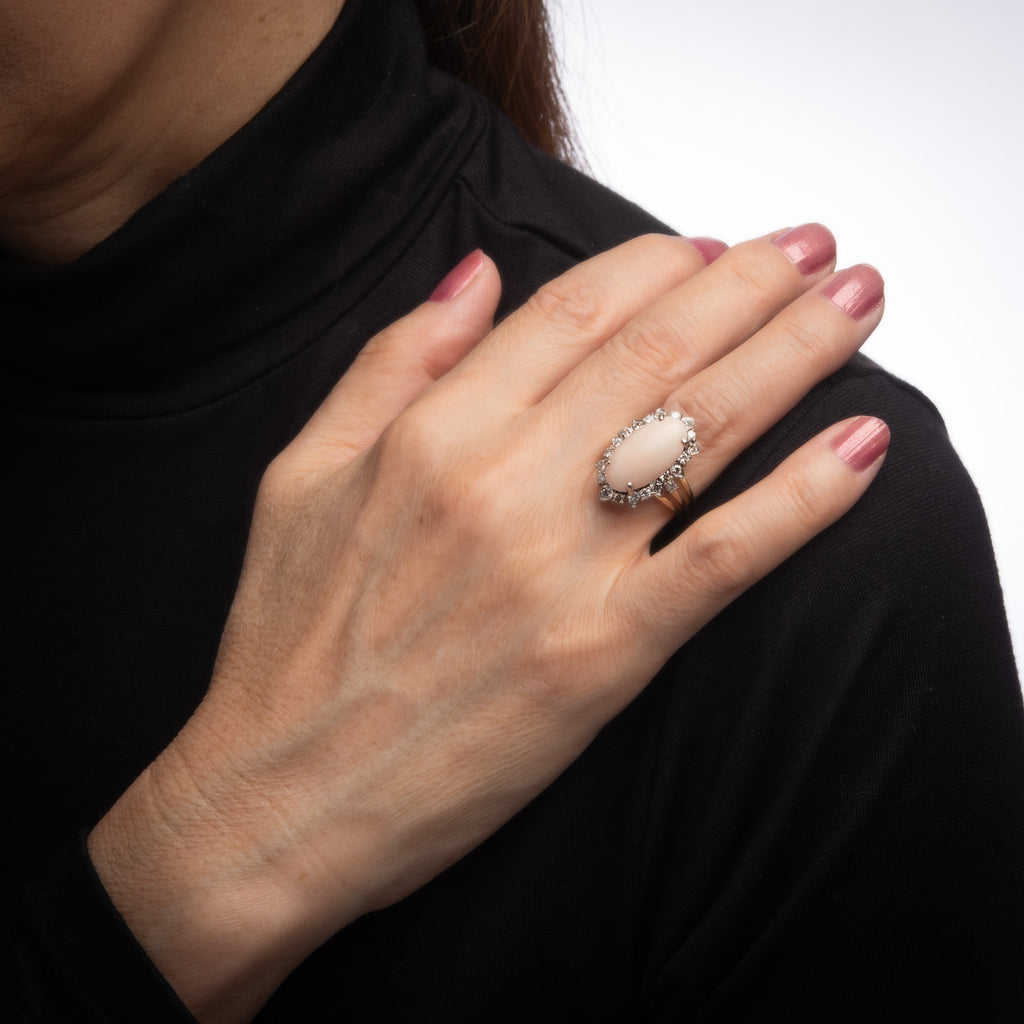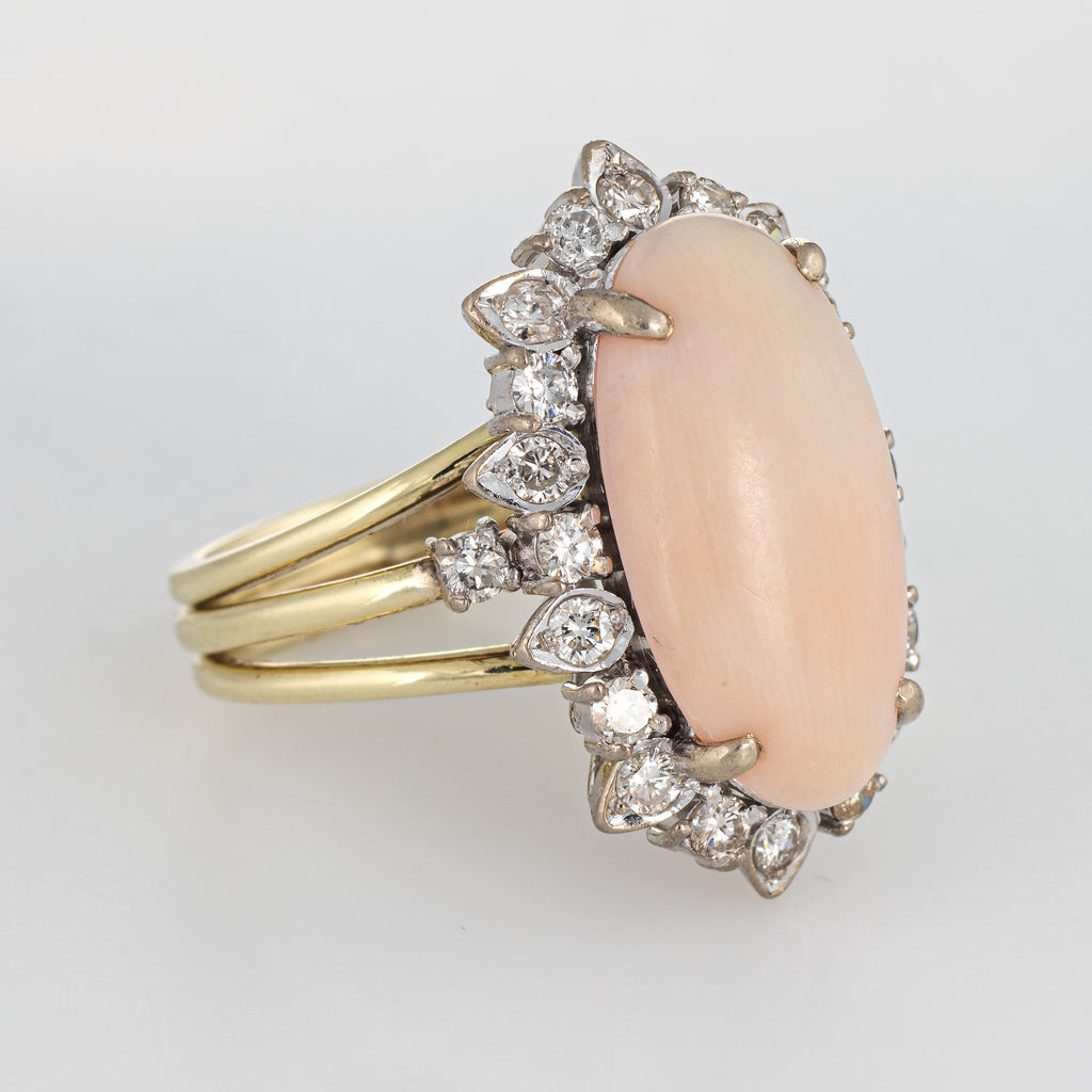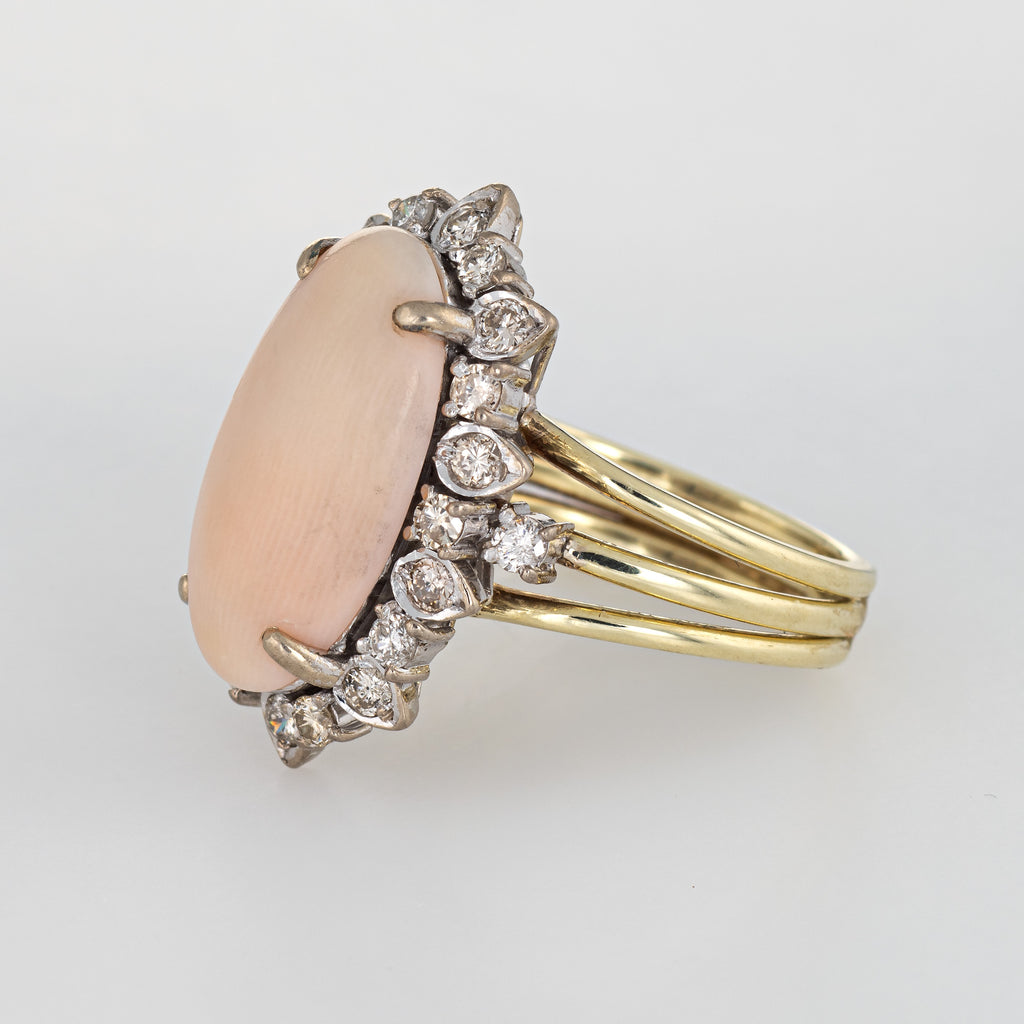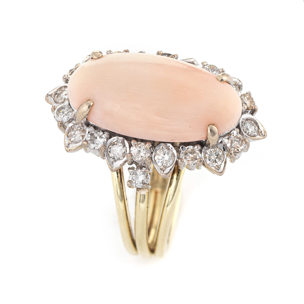 The whisper pink angel skin coral is set into a medium sized oval mount with accenting diamonds. The statement ring adds a nice pop of color on the hand. The medium rise ring (10mm - 0.39 inches) sits comfortably on the finger. The ring is impactful in design and ideal worn day or night.