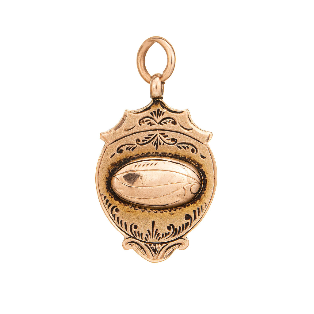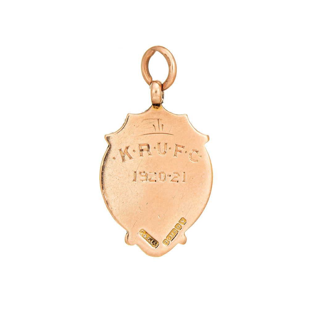 The beautifully detailed medallion dates to 1920-21, designed with a football motif to commemorate the season (given the shape of the ball we believe the sport is Rugby). Medallions were popular around the 1900s along with watch chains and fobs. The medallion/pendant is in very good condition with patina evident. Great for wear on a chain with a larger 5mm bale that can accommodate a thicker chain if desired. The back of the pendant is engraved "K.R.U.F.C 1920-21"