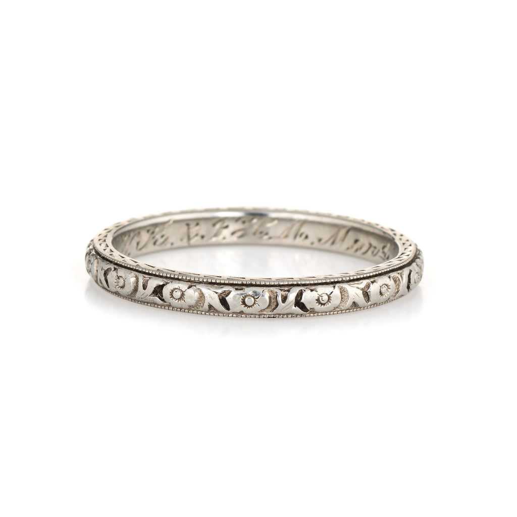 The ring epitomizes vintage charm and would make a lovely wedding band. Also great worn alone or stacked with your jewelry from any era. The inner band is "H.W.K & F.H.M Mard Sept 1-93"