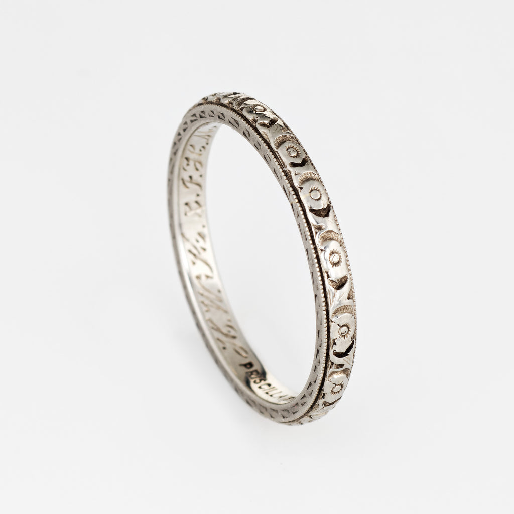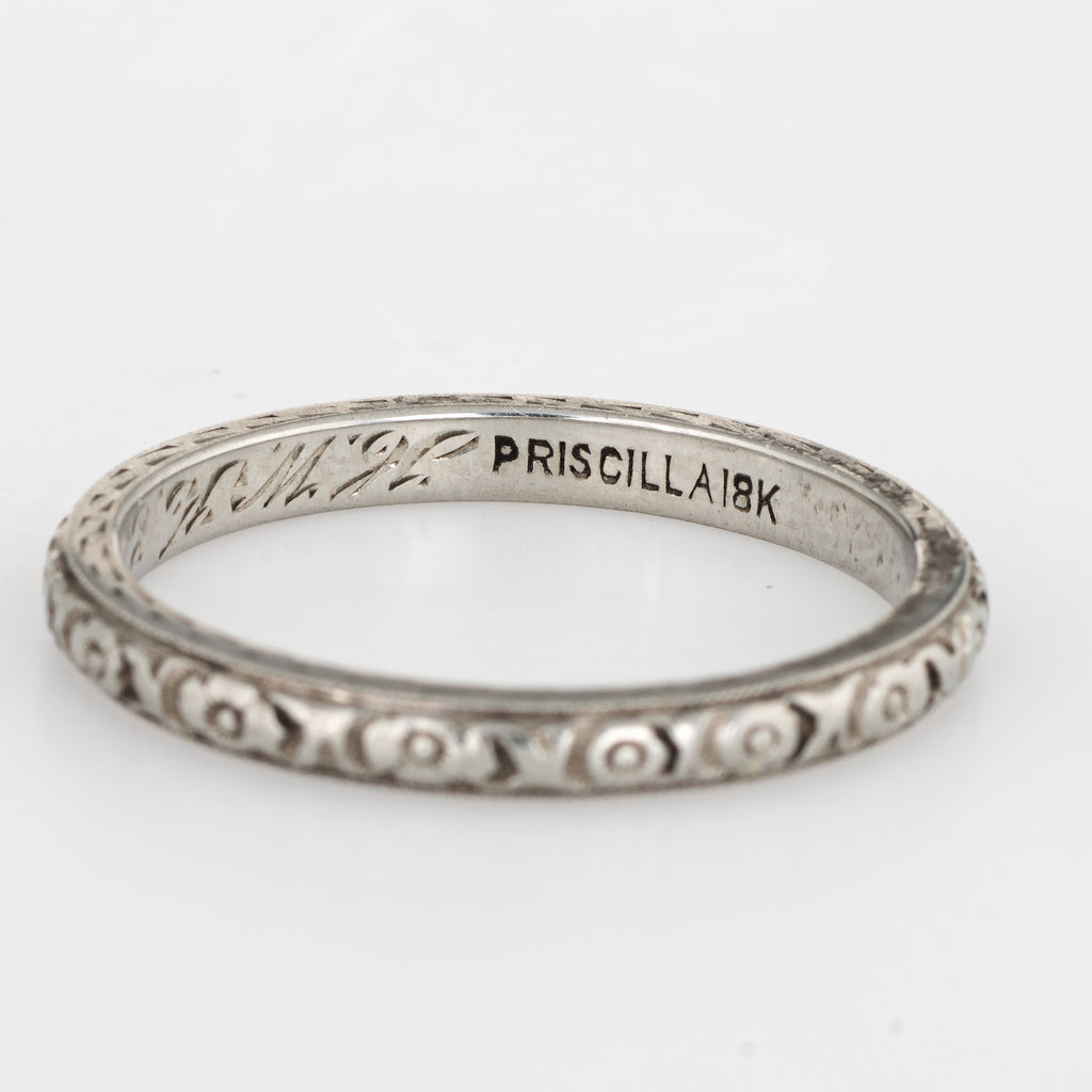 Antique Deco Wedding Band Sz 7.75 18k White Gold Embossed Flowers Vintage