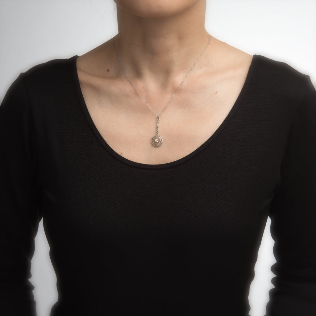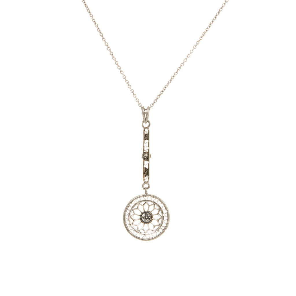 The pendant features fine filigree detail in a greek key and star shaped pattern in a circular mount. The necklace is a later addition to the pendant and measures 16 inches in length. An attractive piece to wear alone or layered with your other fine necklaces.