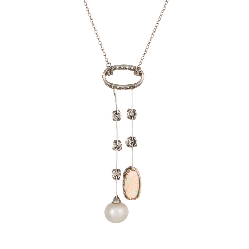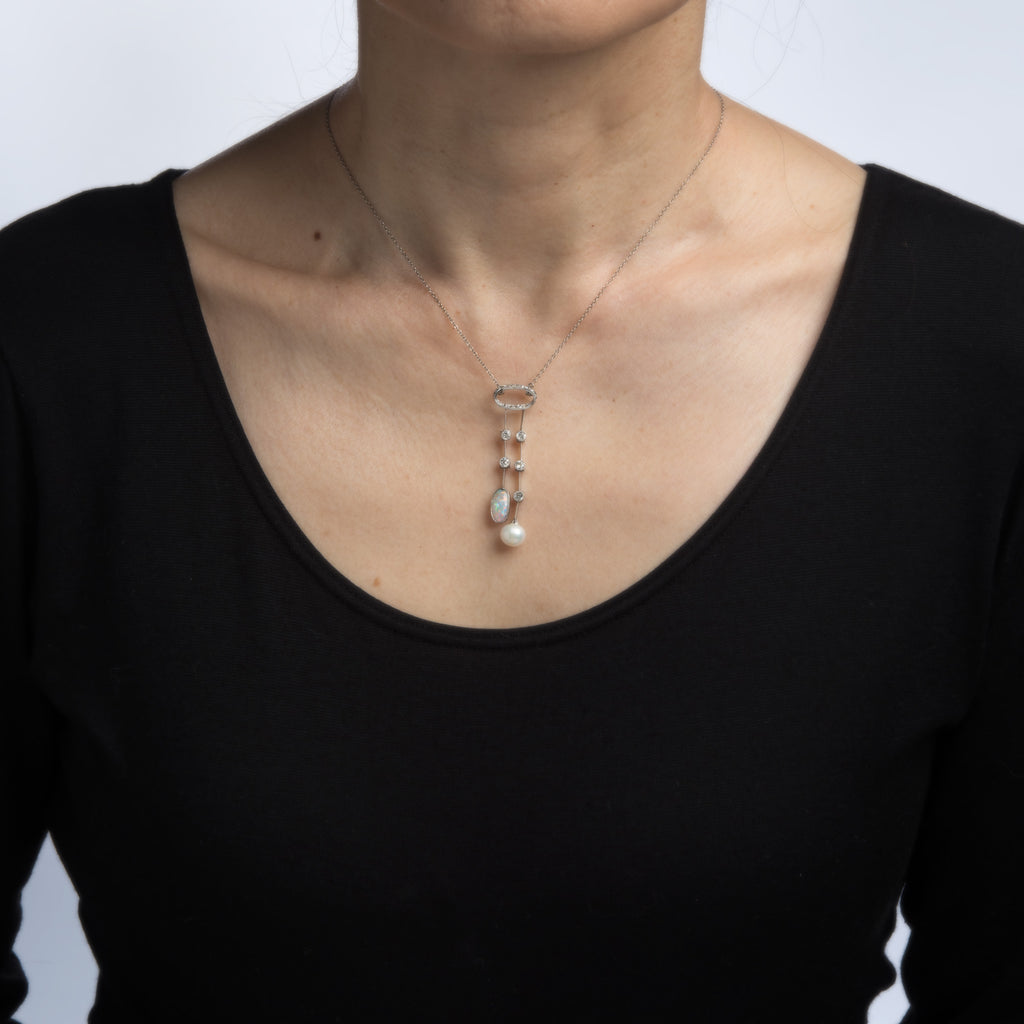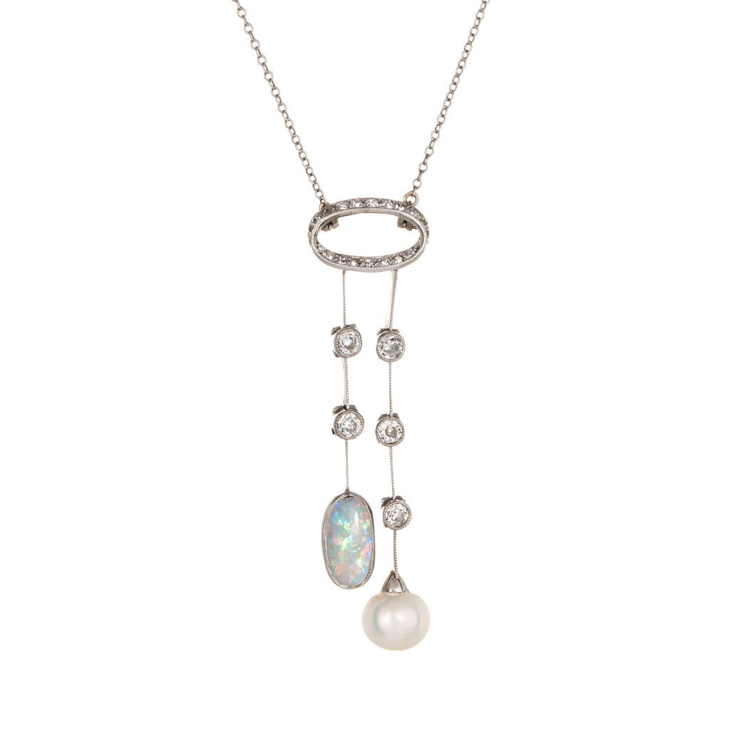 Antique Edwardian Negligee Necklace Opal Diamond Pearl Platinum Vintage Jewelry