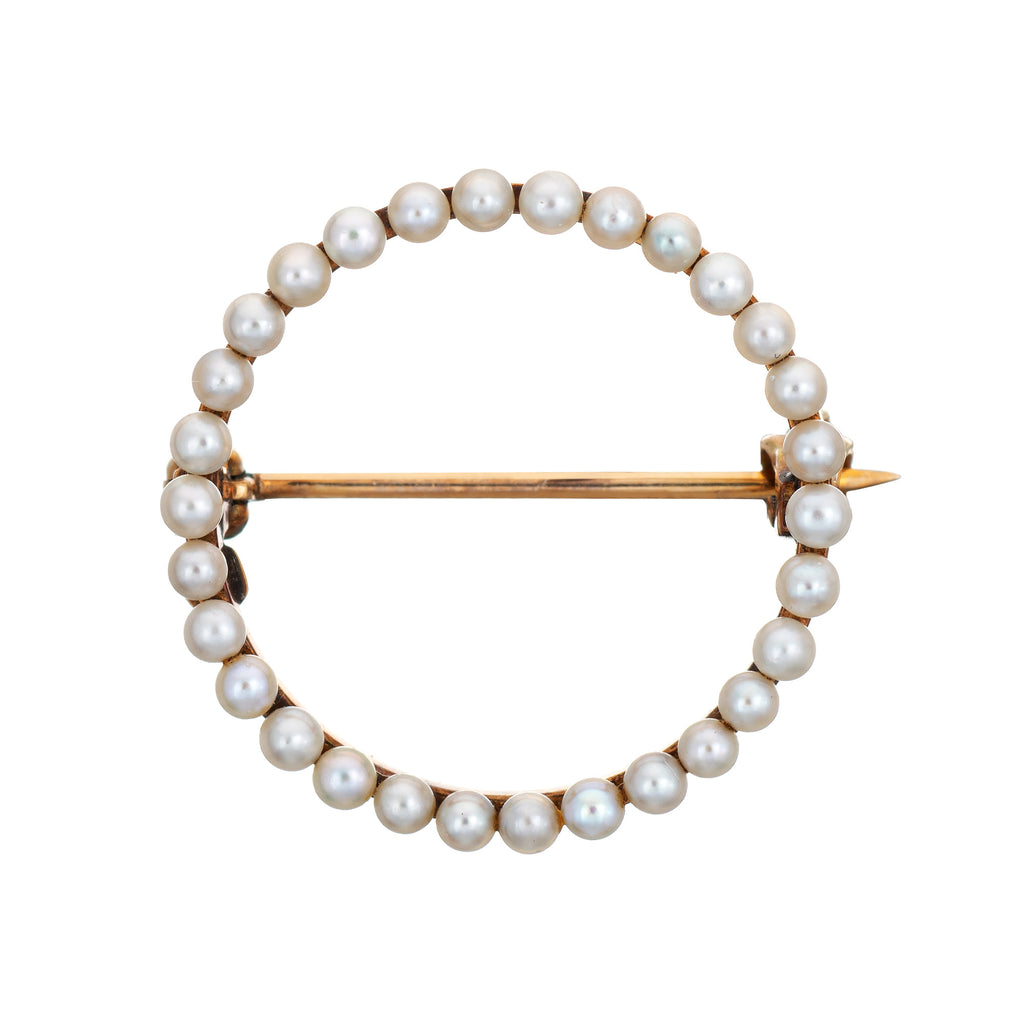 Antique Edwardian Seed Pearl Circle Brooch Vintage 14k Yellow Gold Jewelry 3/4"
