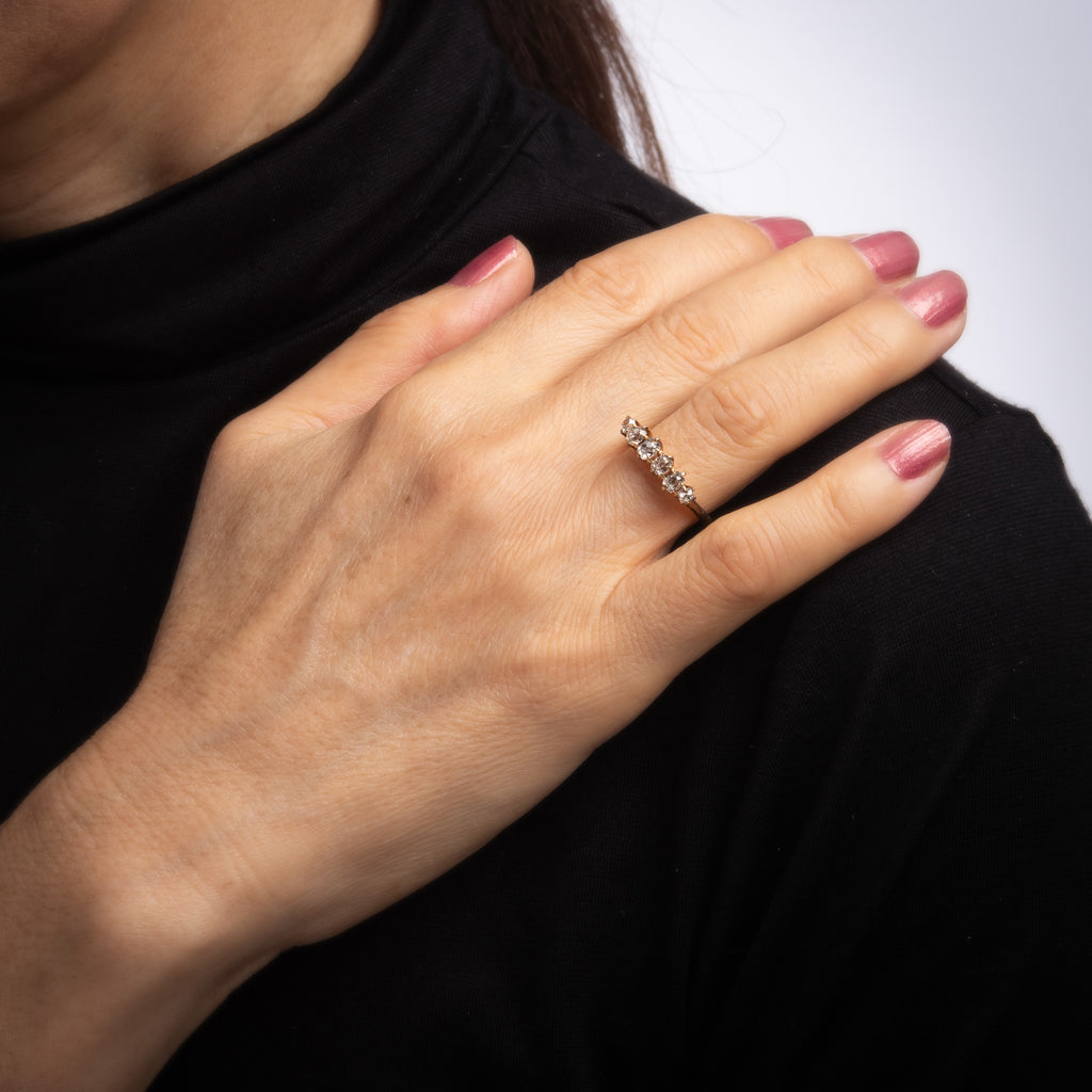 The six old mine cut diamonds are claw set in a singular row. The diamonds offer lovely sparkle and fire. A great ring to wear alone or stacked with your fine jewelry from any era.