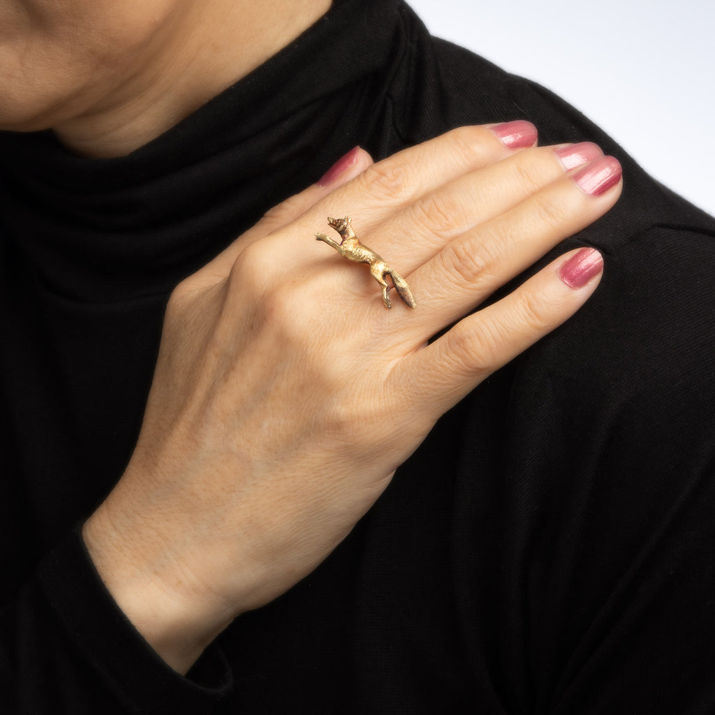 The ring is mounted with the original stick pin. Our jeweler rounded the stick pin into a slim band for the finger. The beautifully detailed fox features lifelike detail. The ring exemplifies the Victorian era when jewelry was crafted with symbols ranging from flora & fauna to a love of the animal kingdom.