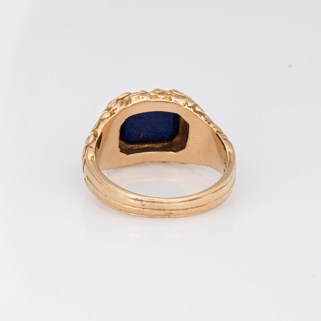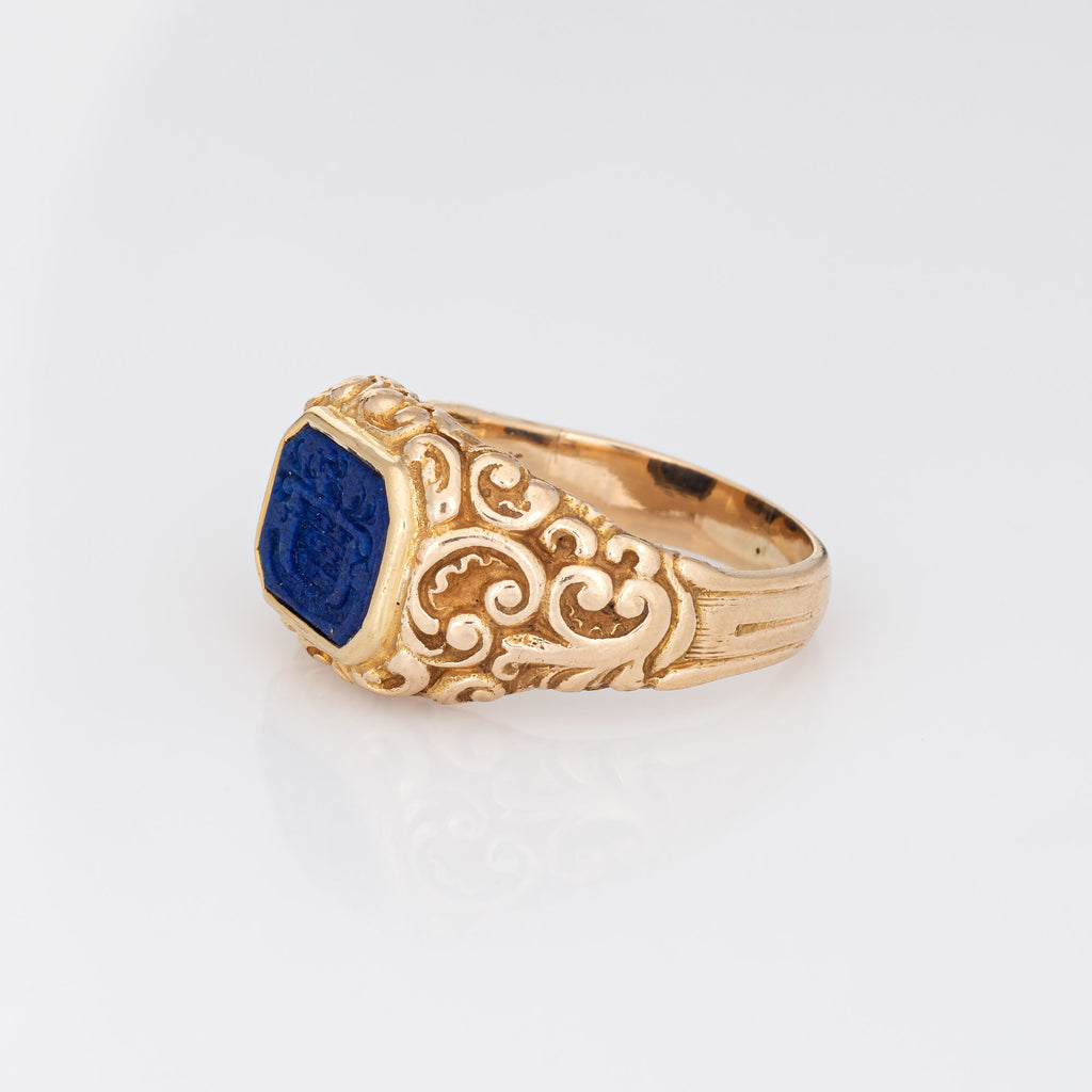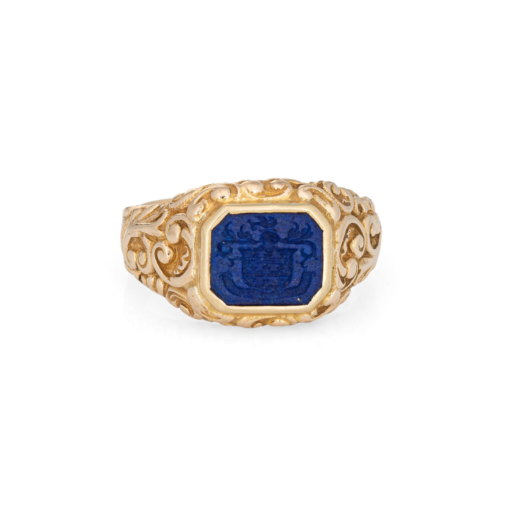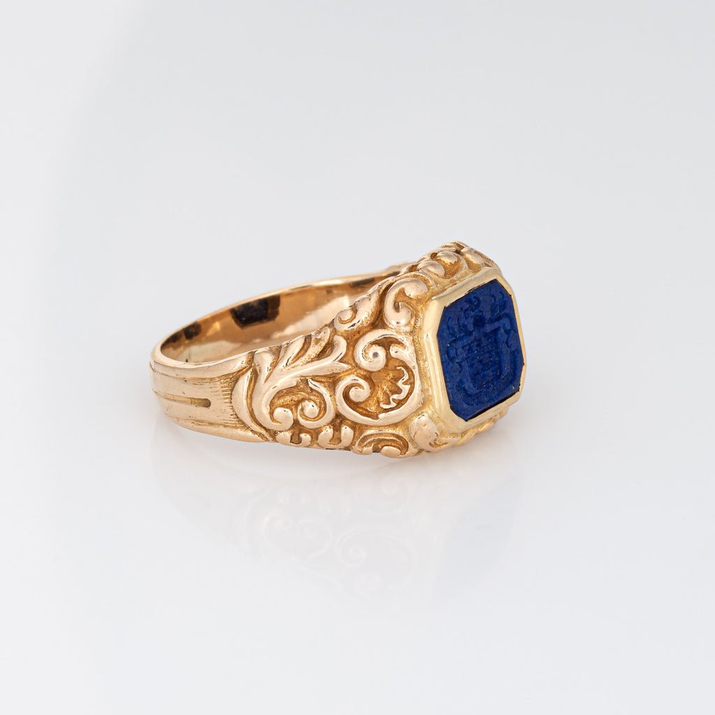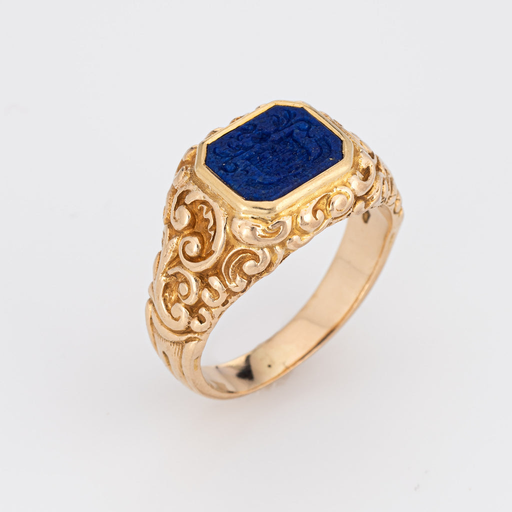 Beautifully detailed antique Victorian lapis lazuli crest ring (circa 1880s to 1900s), crafted in 14 karat yellow gold.