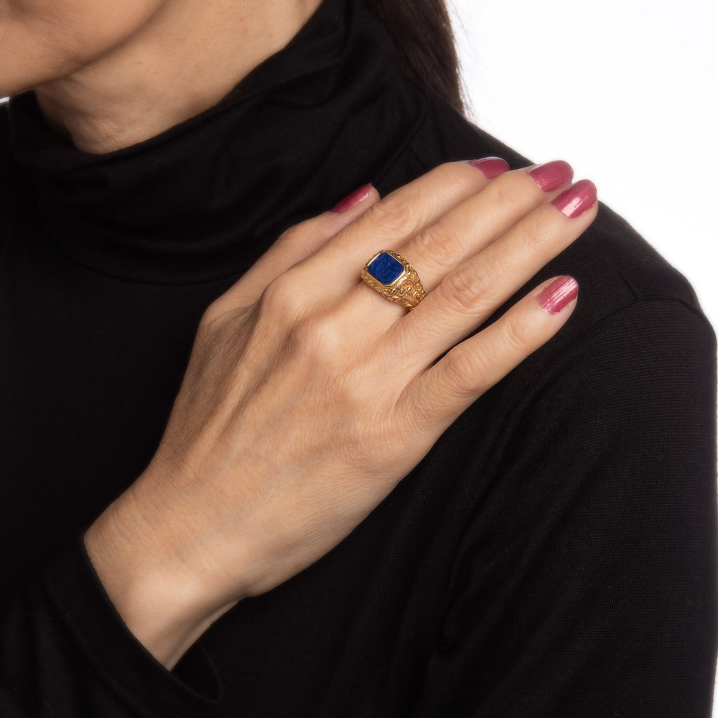 Lapis lazuli measures 9mm x 7.5mm. The lapis is in good condition (few light surface abrasions visible under a 10x loupe from wear over the years).