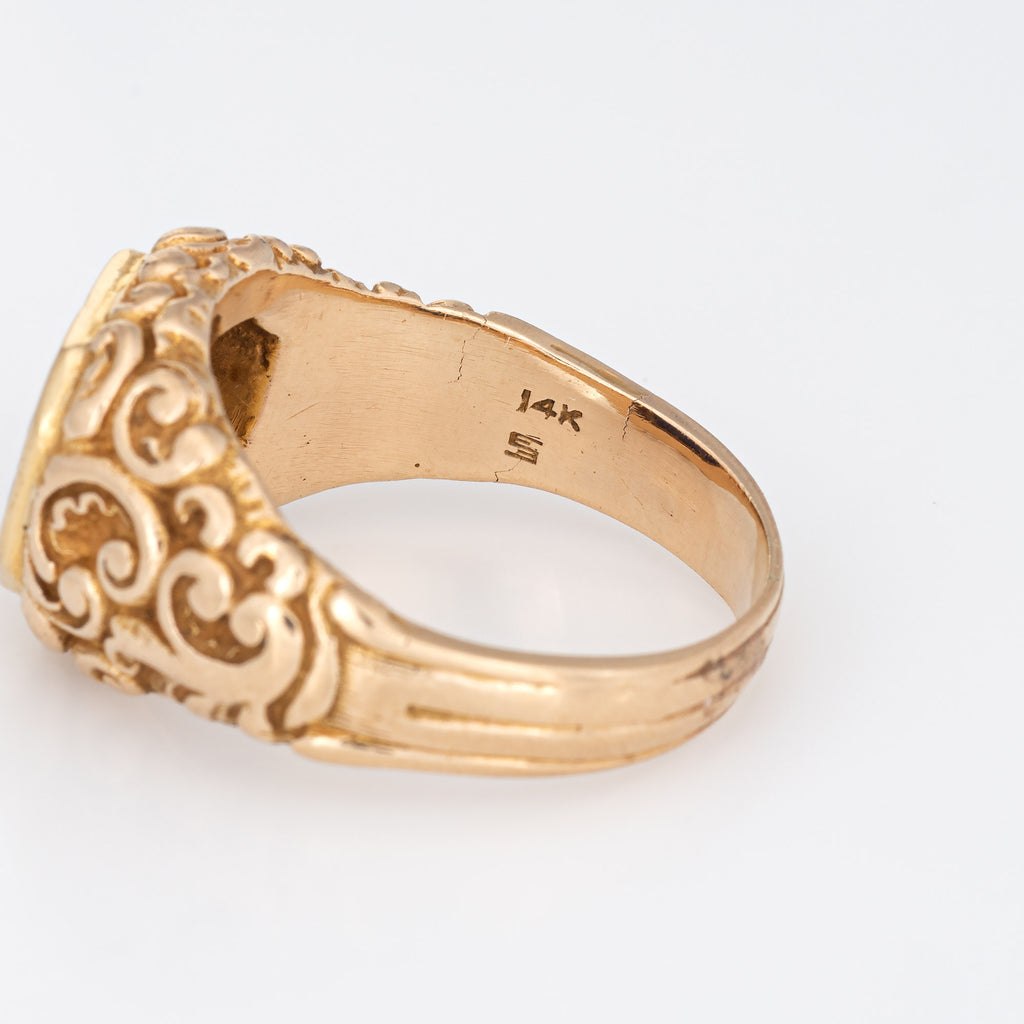 Metal & Hallmark: 14 karat yellow gold. The ring is hallmarked "14k"