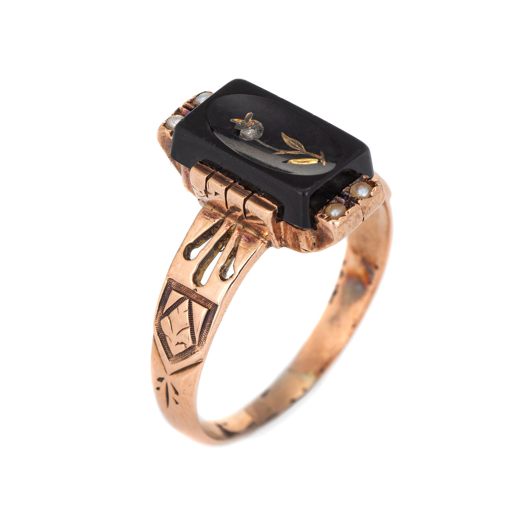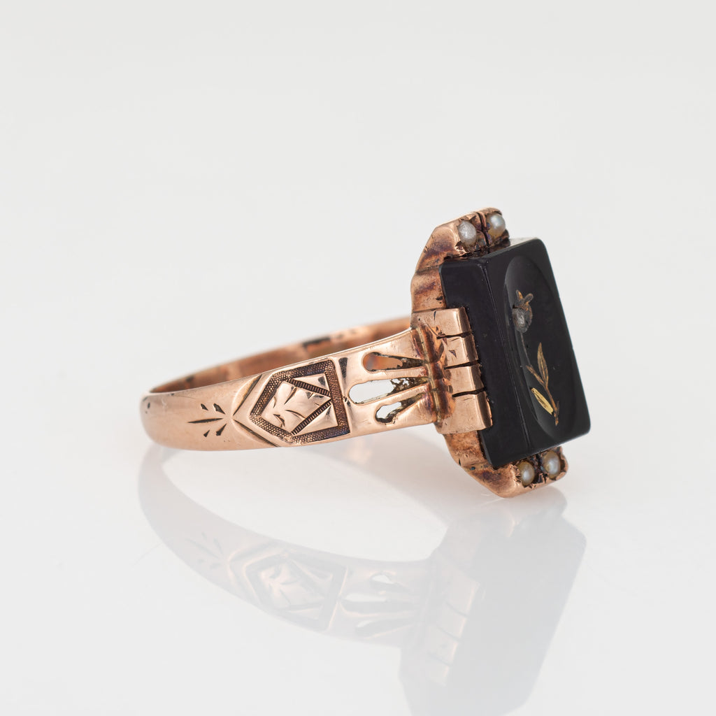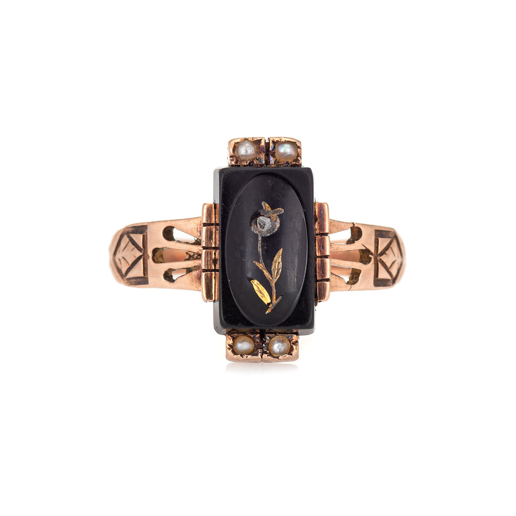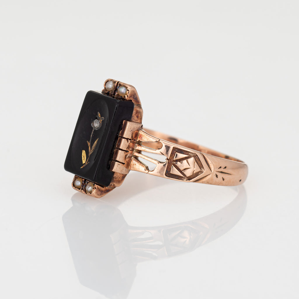 The onyx mount features an oval recessed mount highlighting a diamond set flower. The style of ring was worn during the Victorian era to memorialize a loved one.