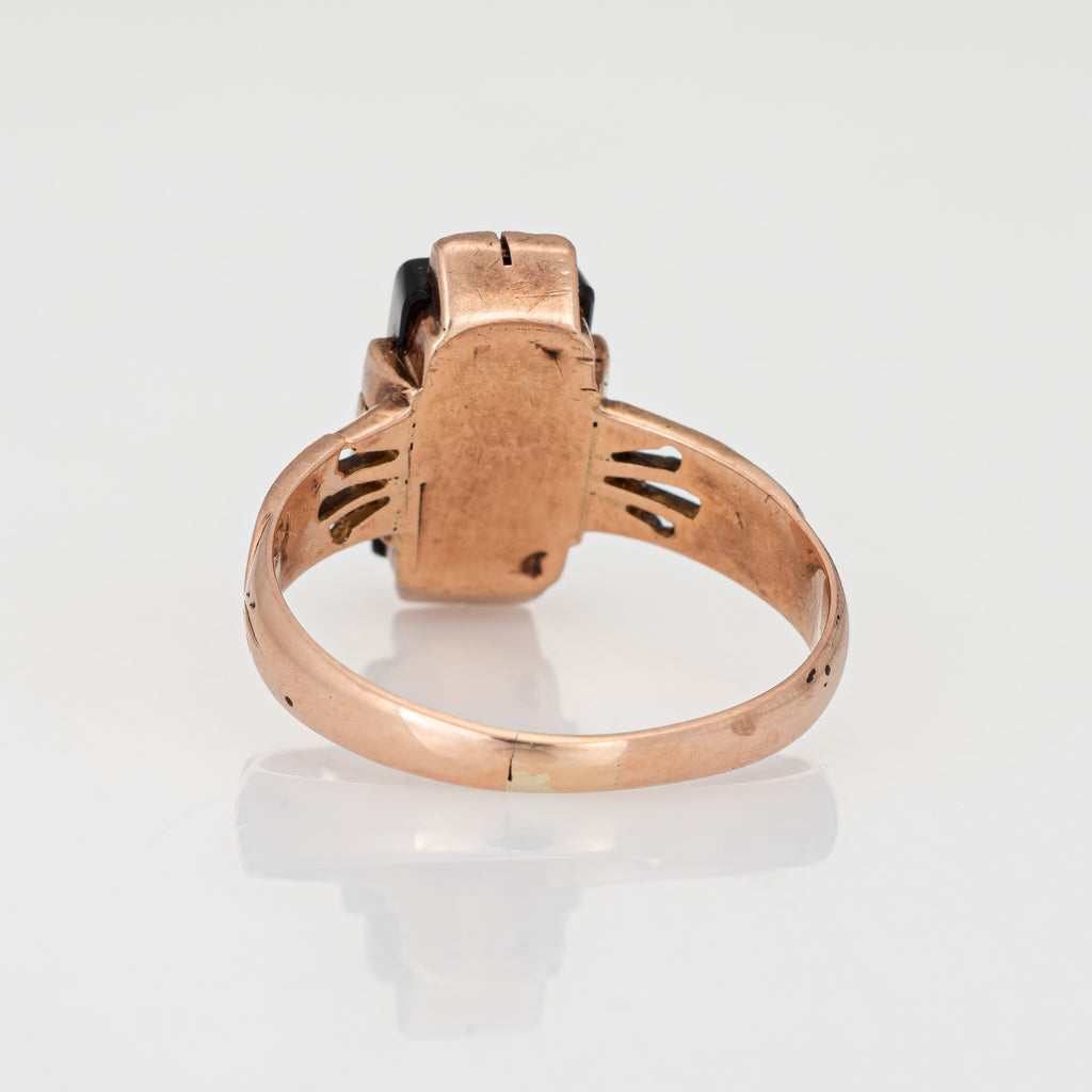 Finely detailed antique Victorian ring (circa 1880s to 1900s) crafted in 10 karat rose gold.