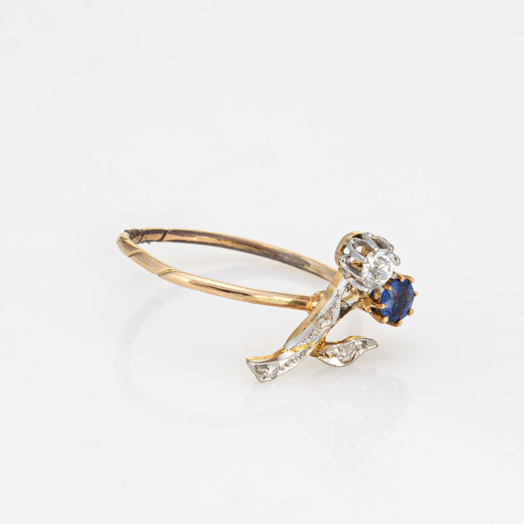 Originally an antique Victorian era stick pin (circa 1880s to 1900s), the sapphire & diamond ring is crafted in 14 karat yellow gold.