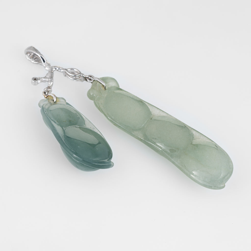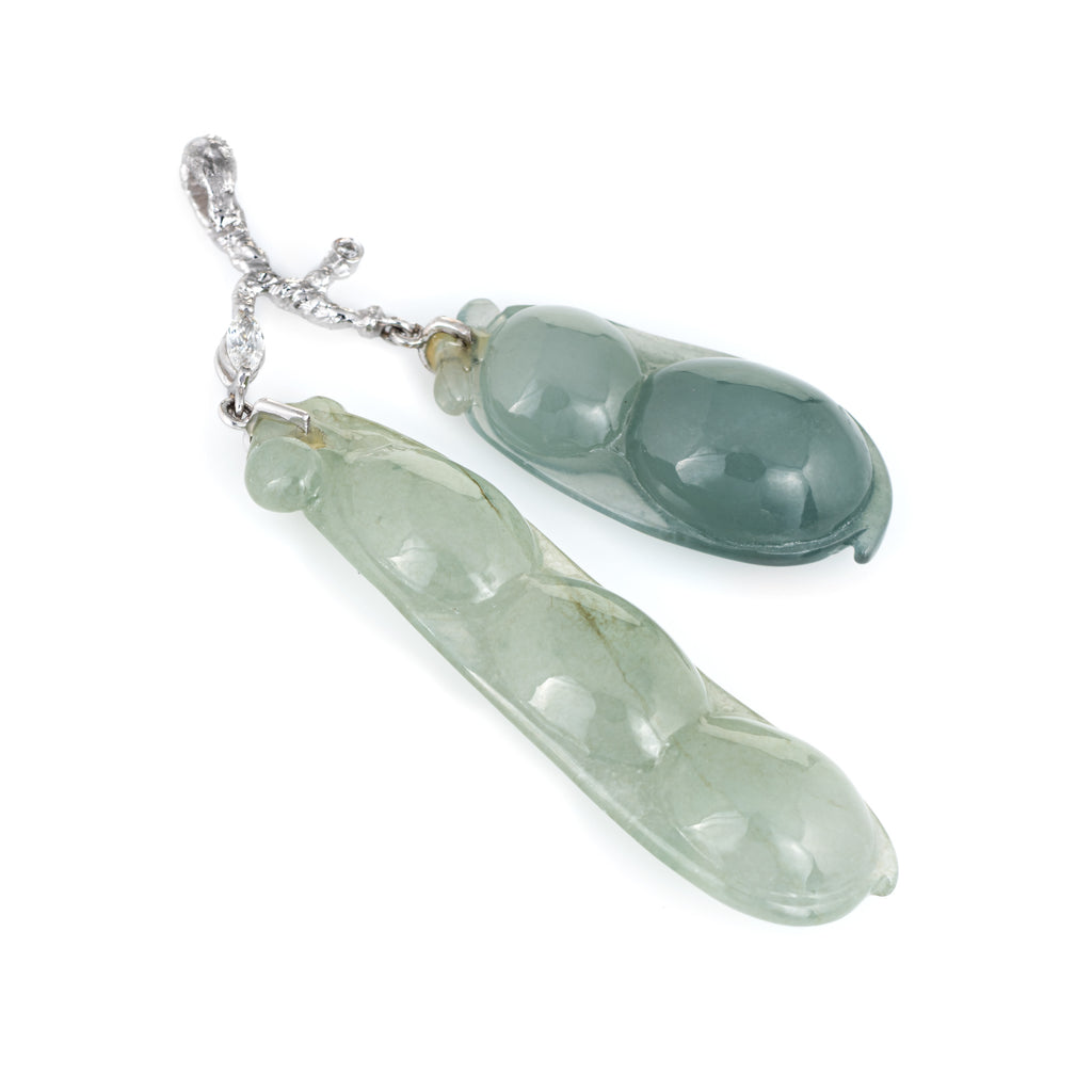 Finely detailed carved jade pea in the pod diamond pendant crafted in 18k white gold.