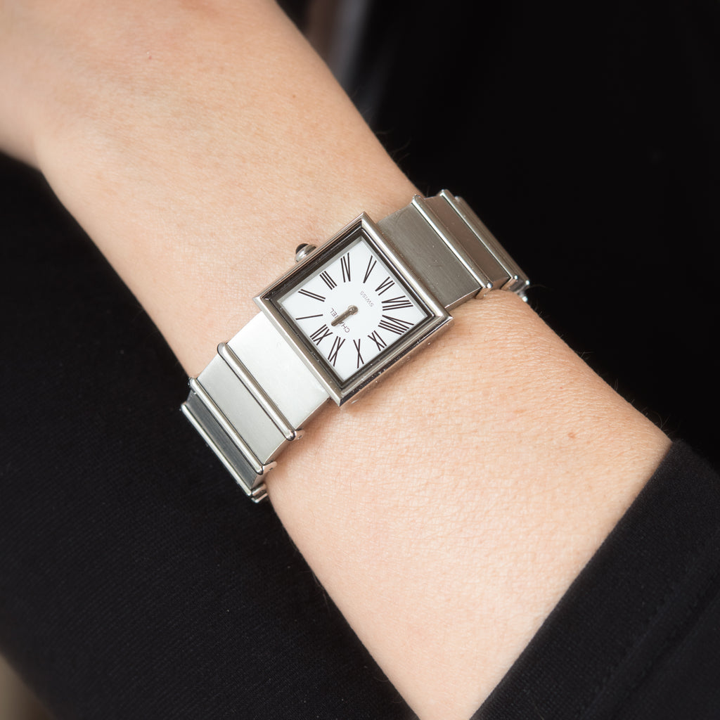 Size & Measurements:  The square Chanel watch face measures 23mm diameter (0.90 inches). The watch will fit a wrist up to 6 inches (3 links are included if you wish to enlarge the watch). The watch band measures 18mm wide (0.70 inches).