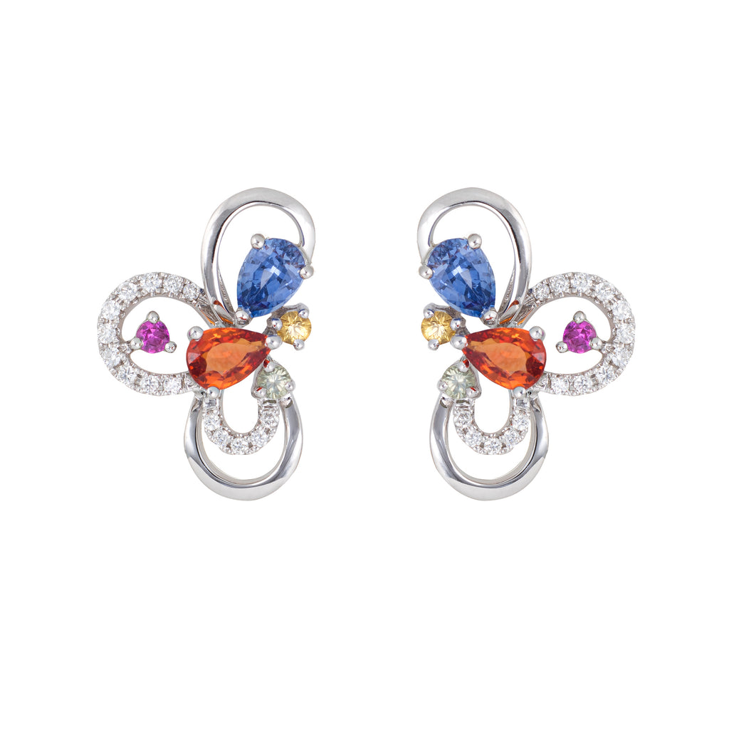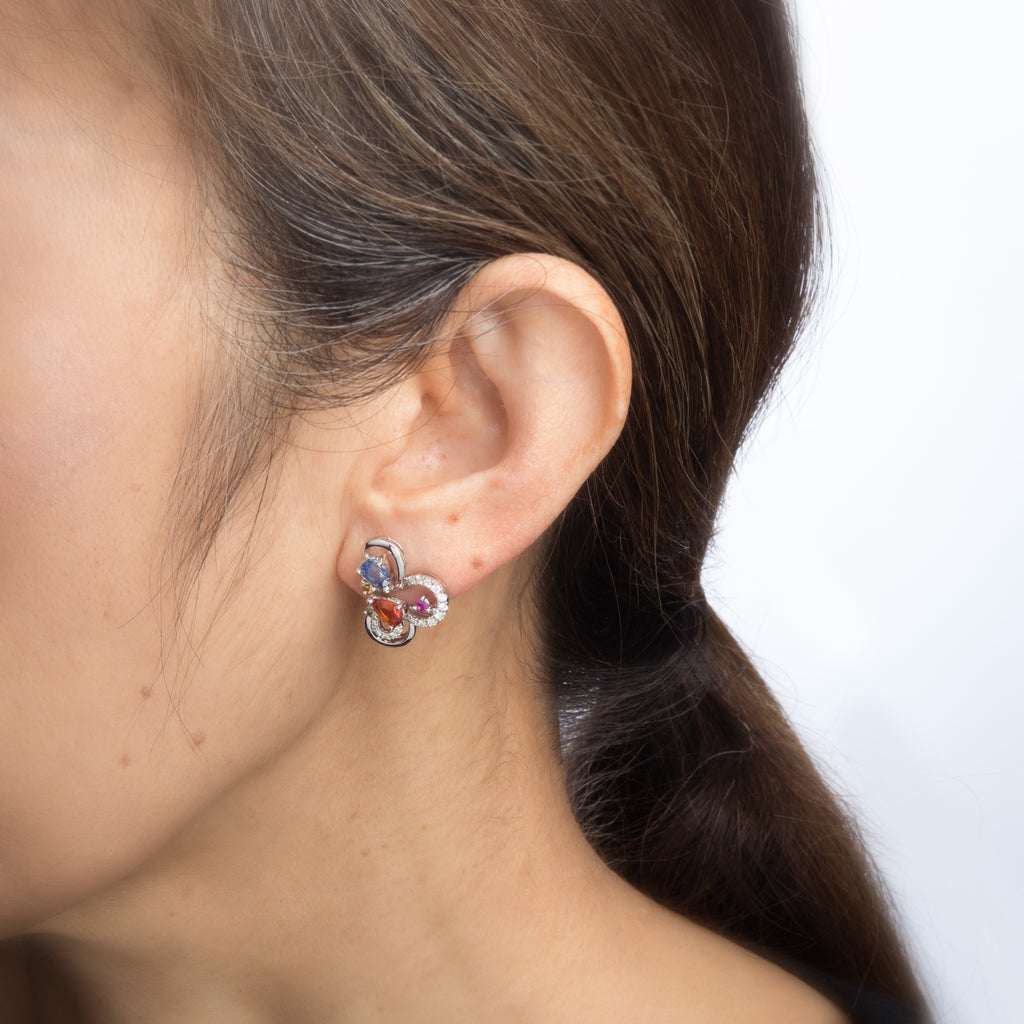 The charming earrings highlight the colored sapphires in a cluster setting. The earrings can easily transition from day to evening wear & are fitted with post and tension backings for pierced ears.