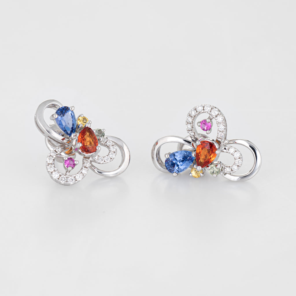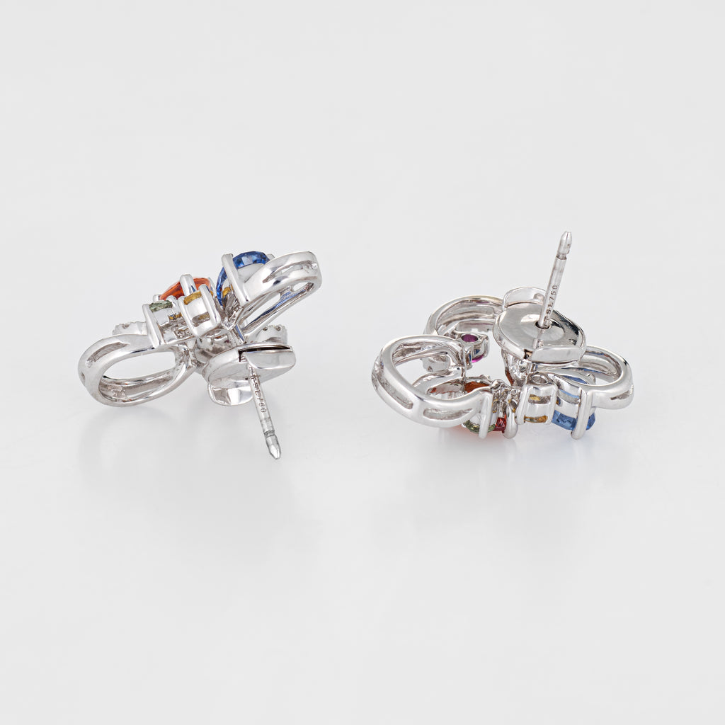 Finely detailed pair of estate colored sapphire & diamond cluster earrings crafted in 18k white gold.