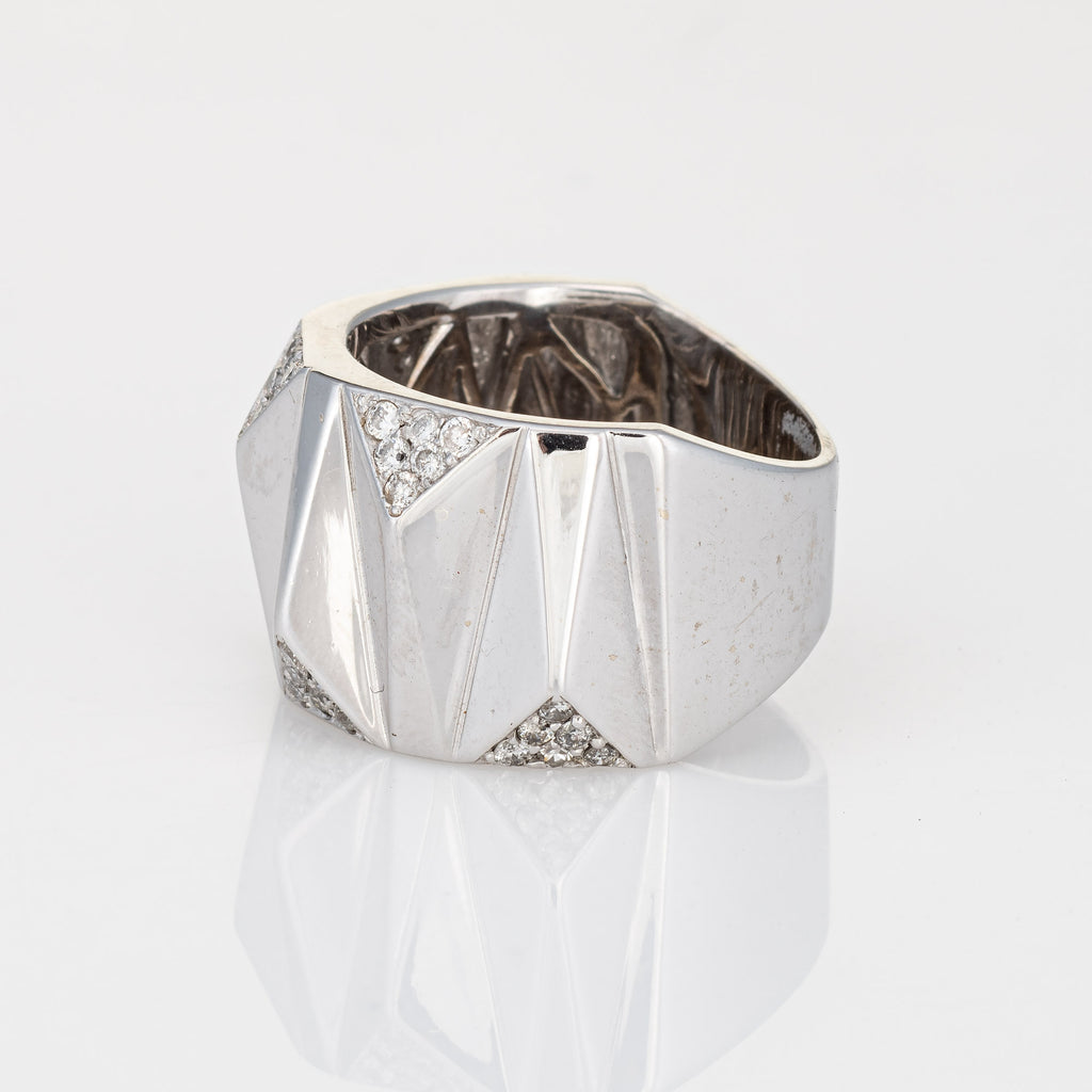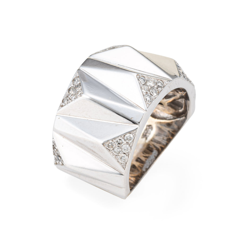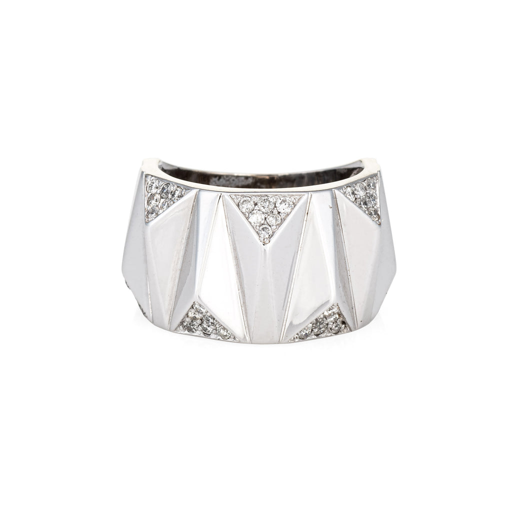 The wide 13mm band (0.51 inches) with a cool contemporary look has a pointed diamond set design. The band makes a nice statement on the hand and is ideal worn alone or layered with your fine jewelry from any era. The low rise ring (4mm - 0.15 inches) sits comfortably on the finger.
