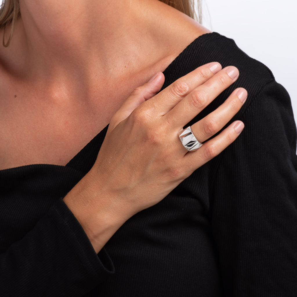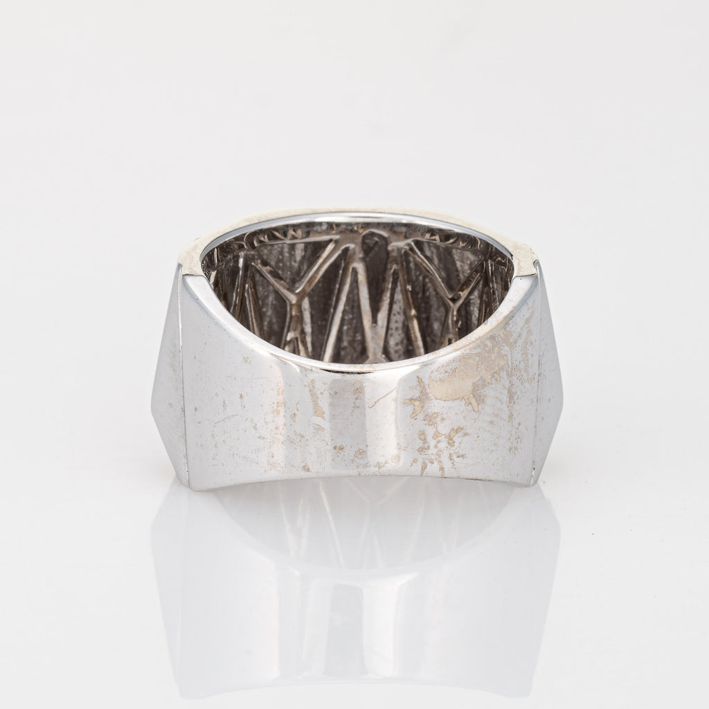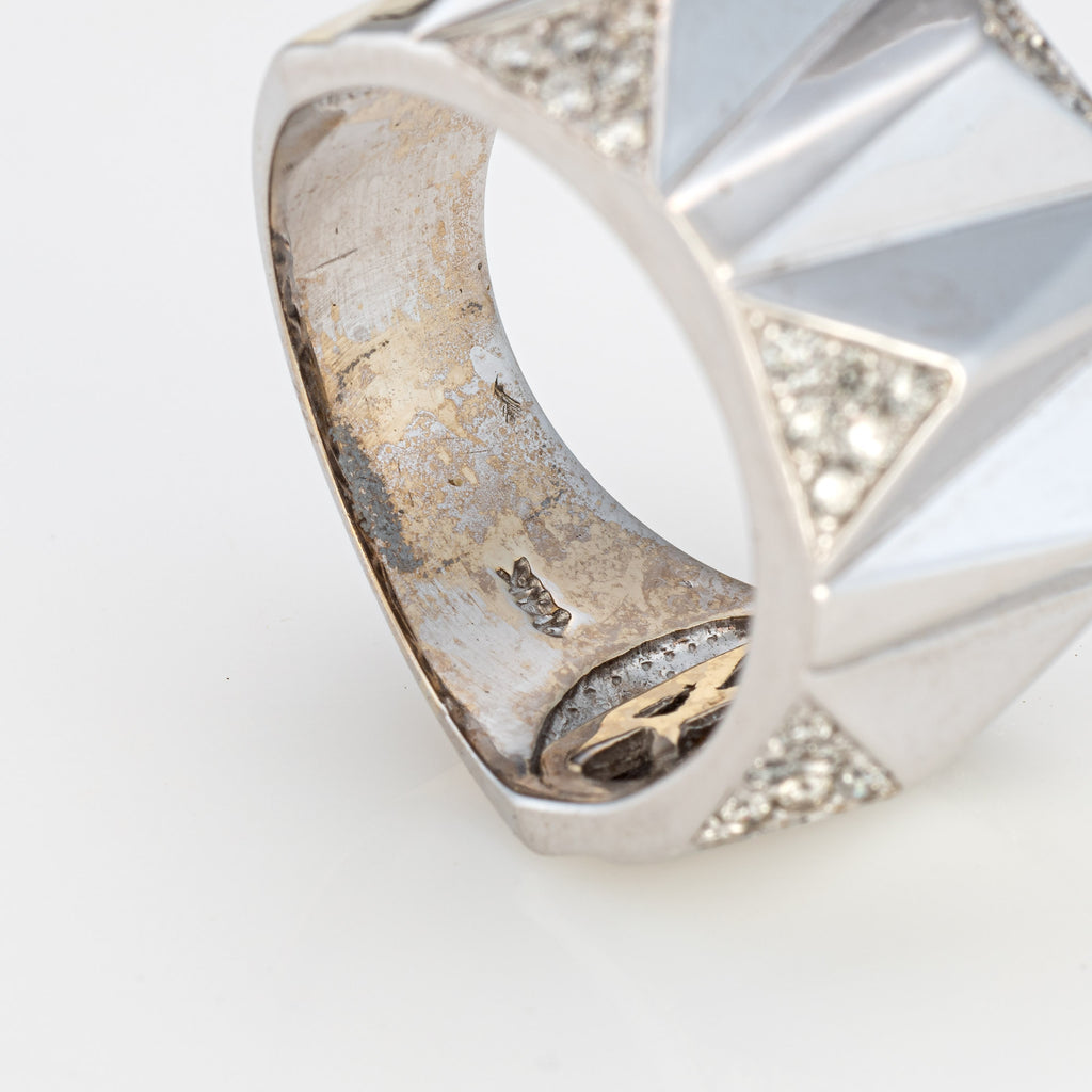 The wide 13mm band (0.51 inches) with a cool contemporary look has a pointed diamond set design. The band makes a nice statement on the hand and is ideal worn alone or layered with your fine jewelry from any era. The low rise ring (4mm - 0.15 inches) sits comfortably on the finger.