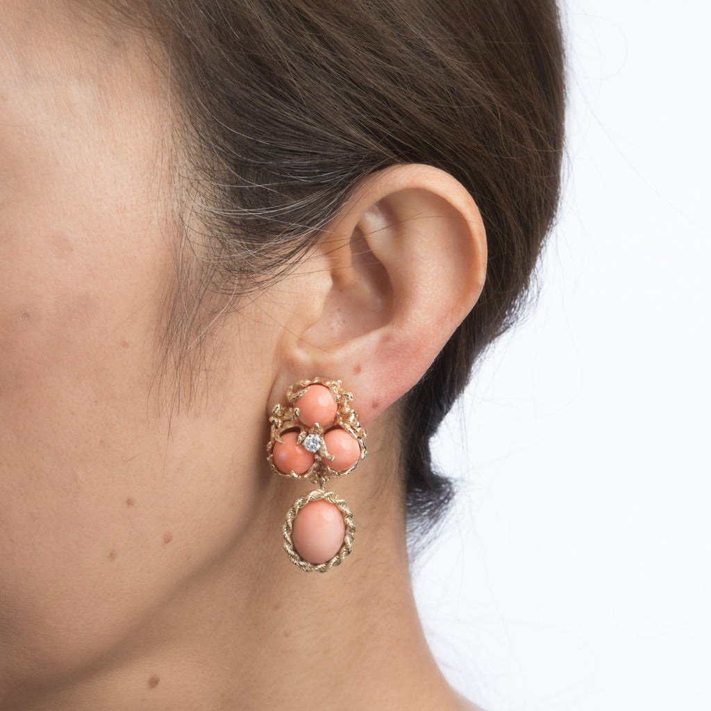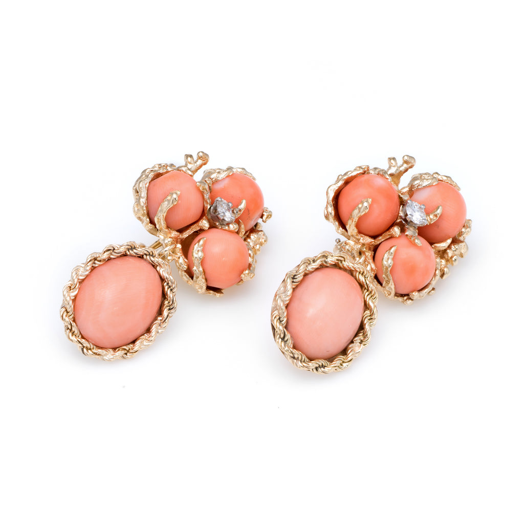 Stones: 6 pieces of natural coral measure 7mm each (upper) and 13.5mm x 10.5mm (lower). The total coral weight is estimated at 25 carats. Two estimated 0.15 carat round brilliant cut diamonds total an estimated 0.30 carats (estimated at H color and SI1 clarity). The coral is in excellent condition and free of cracks or chips.