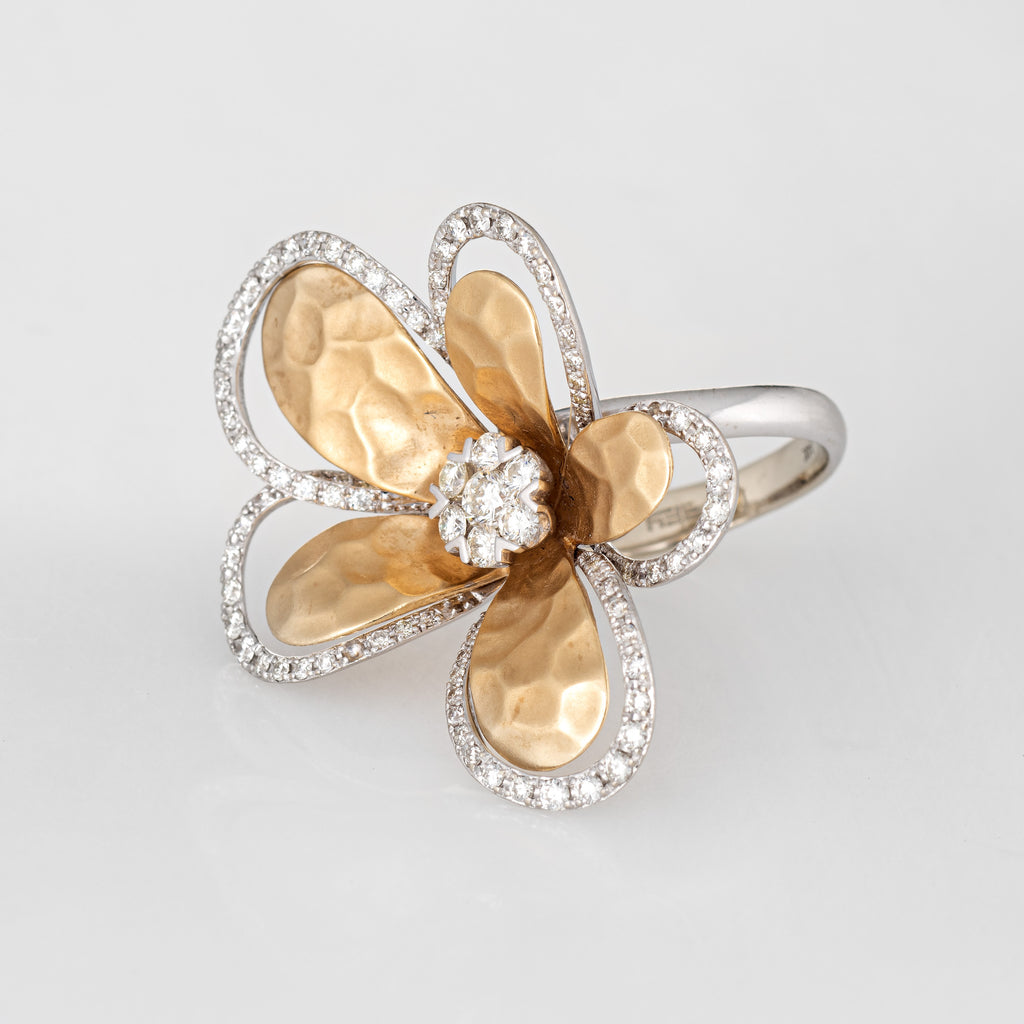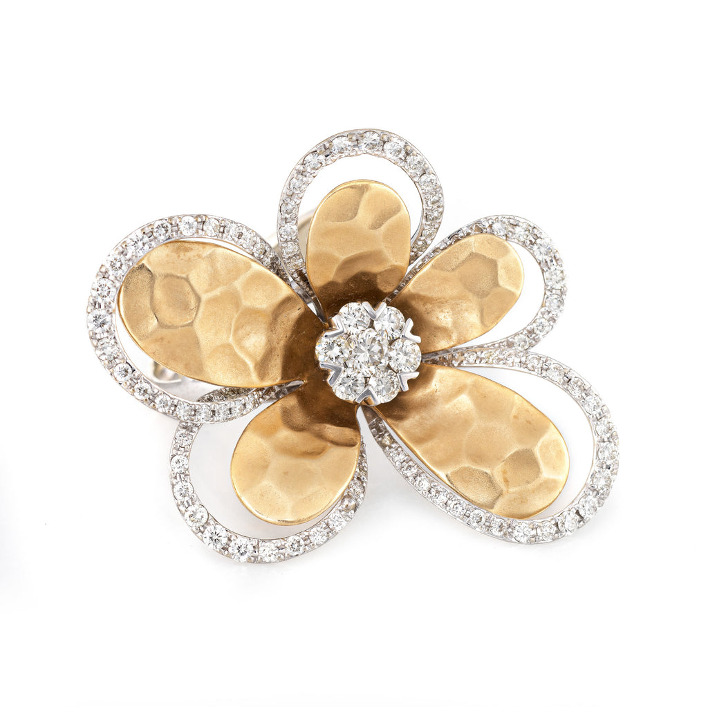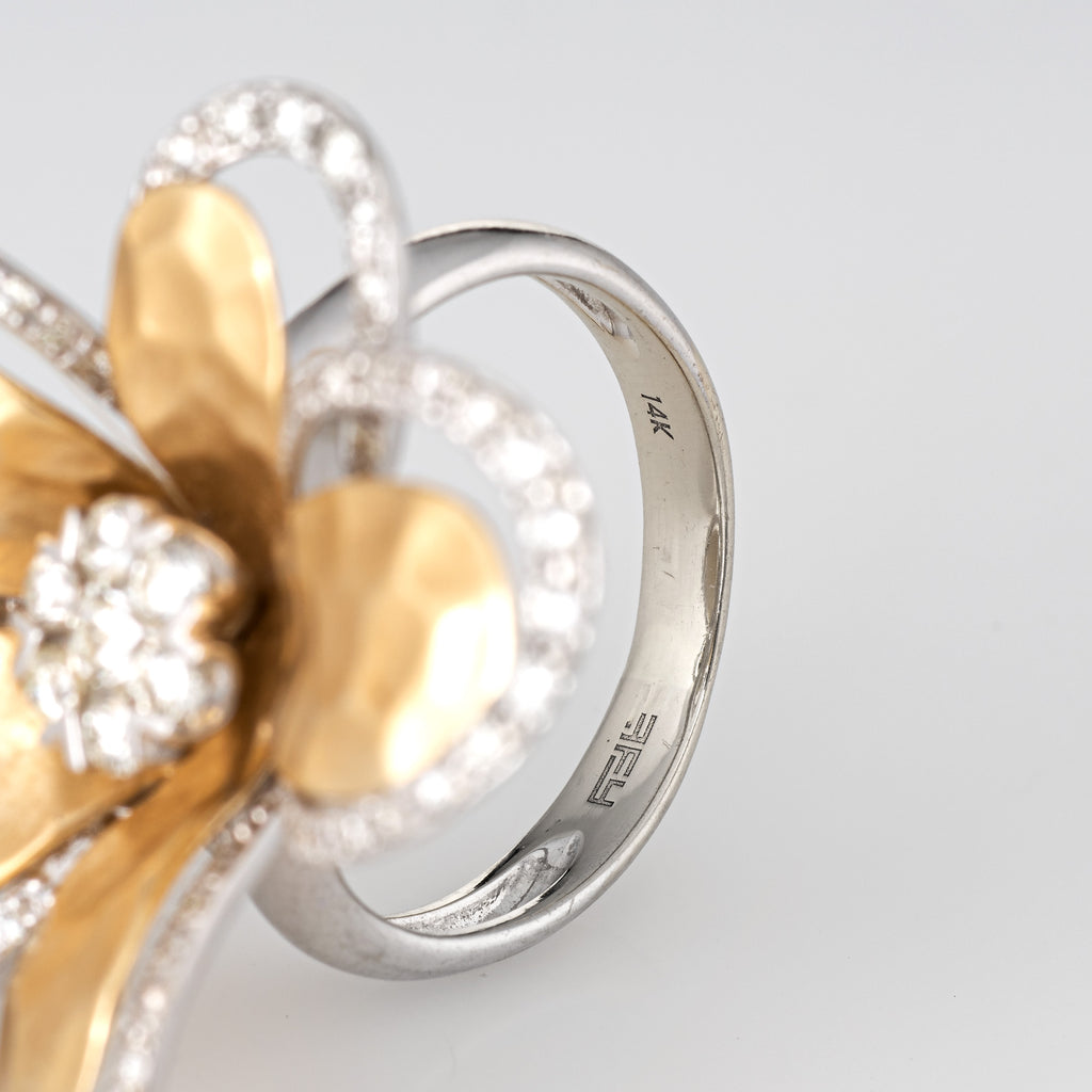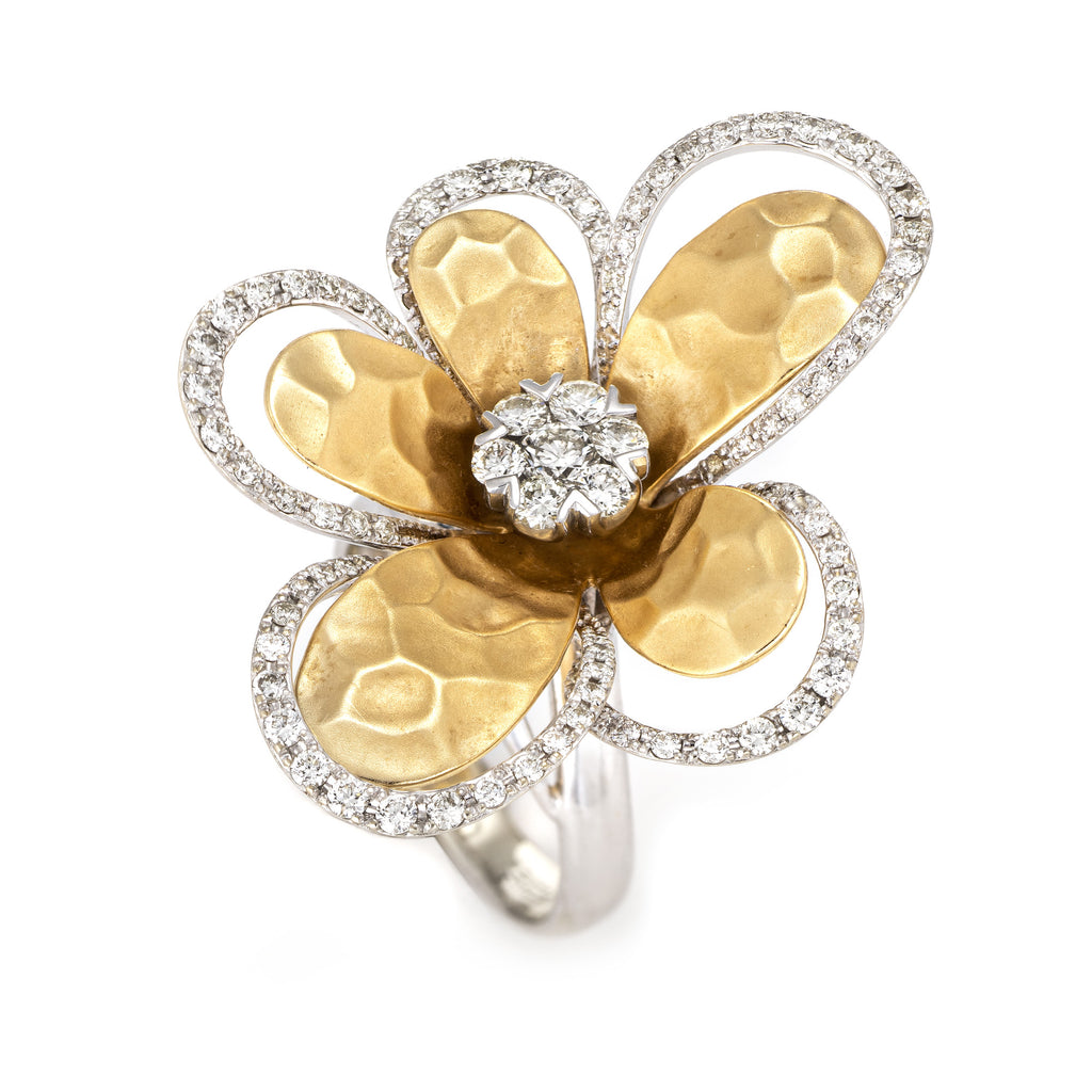 The large flower features hammered gold inner leaves in 14k yellow gold with diamonds to the outer petals and center. The ring makes a great statement on the hand. The high rise ring (12mm - 0.47 inches) sits comfortably on the finger. The ring is impactful in design and ideal worn day or night.