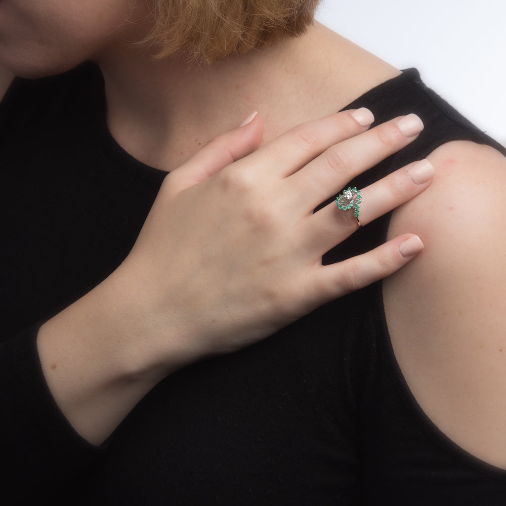 Centrally mounted estimated 0.25 carat round brilliant cut diamond (estimated at H-I color and SI2 clarity), is accented with an estimated 0.34 carats of emeralds.