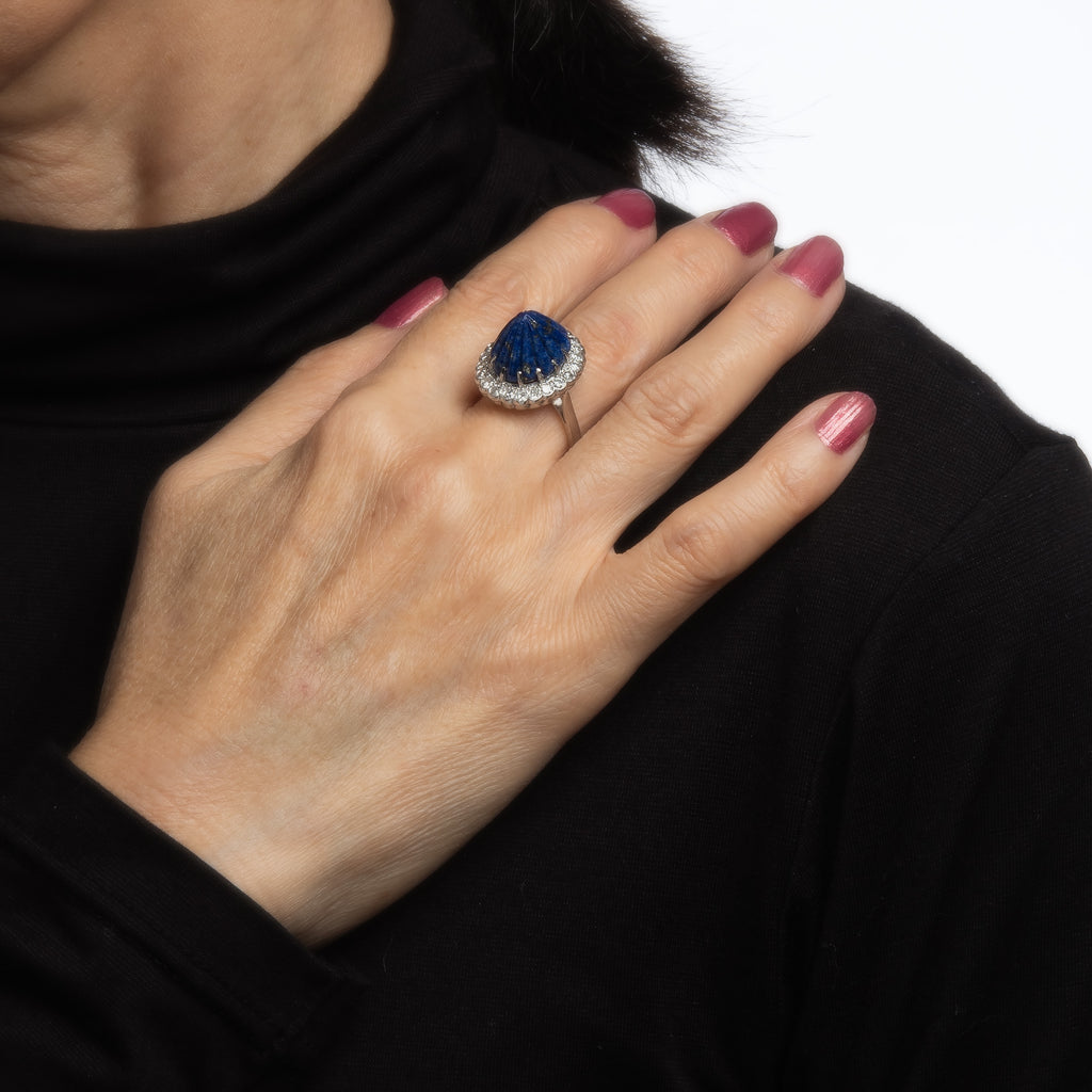 The cobalt blue fluted lapis lazuli rises 9mm to form a point, a striking and unique ring that highlights the great design that came out of the Mid Century era (1950s to 1960s). The statement ring adds a nice pop of color on the hand. The high rise ring (15mm - 0.59 inches) sits comfortably on the finger. Great for day or evening wear.