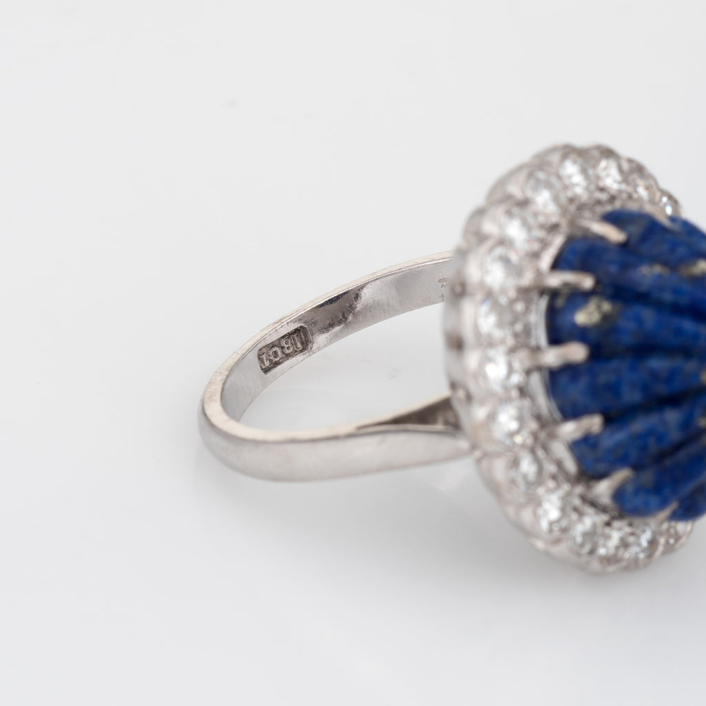 Stones: Fluted lapis lazuli measures 14mm x 12mm, accented with an estimated 1 carat of diamonds (estimated at H-I color and VS2-SI2 clarity). The lapis is in excellent condition and free of cracks or chips.
