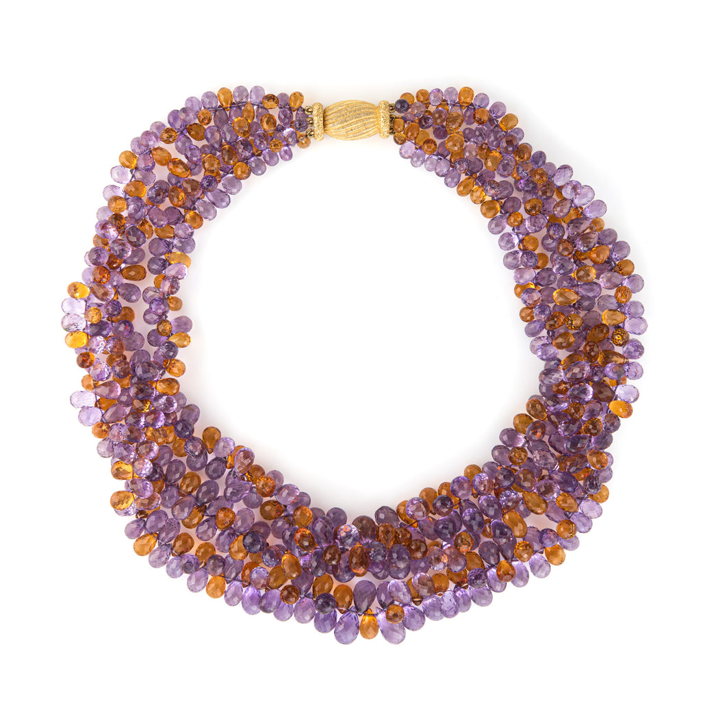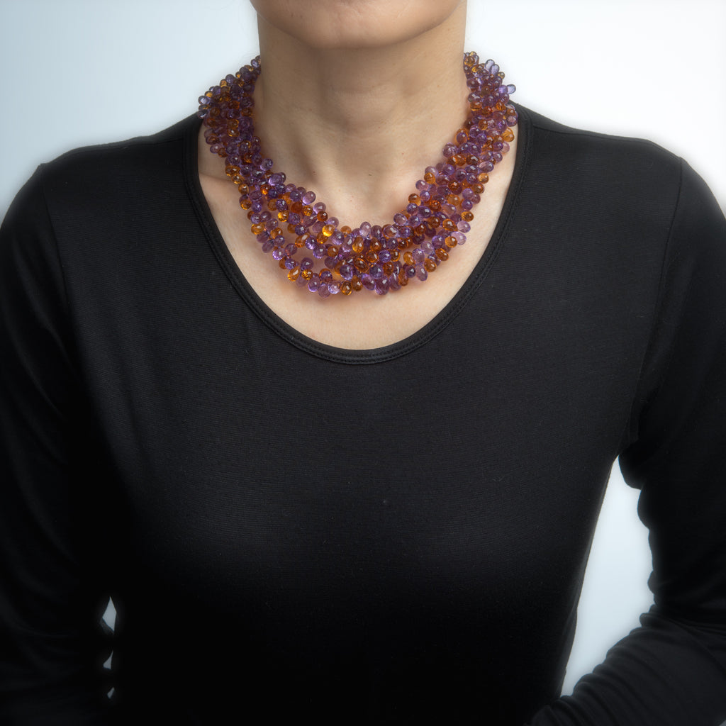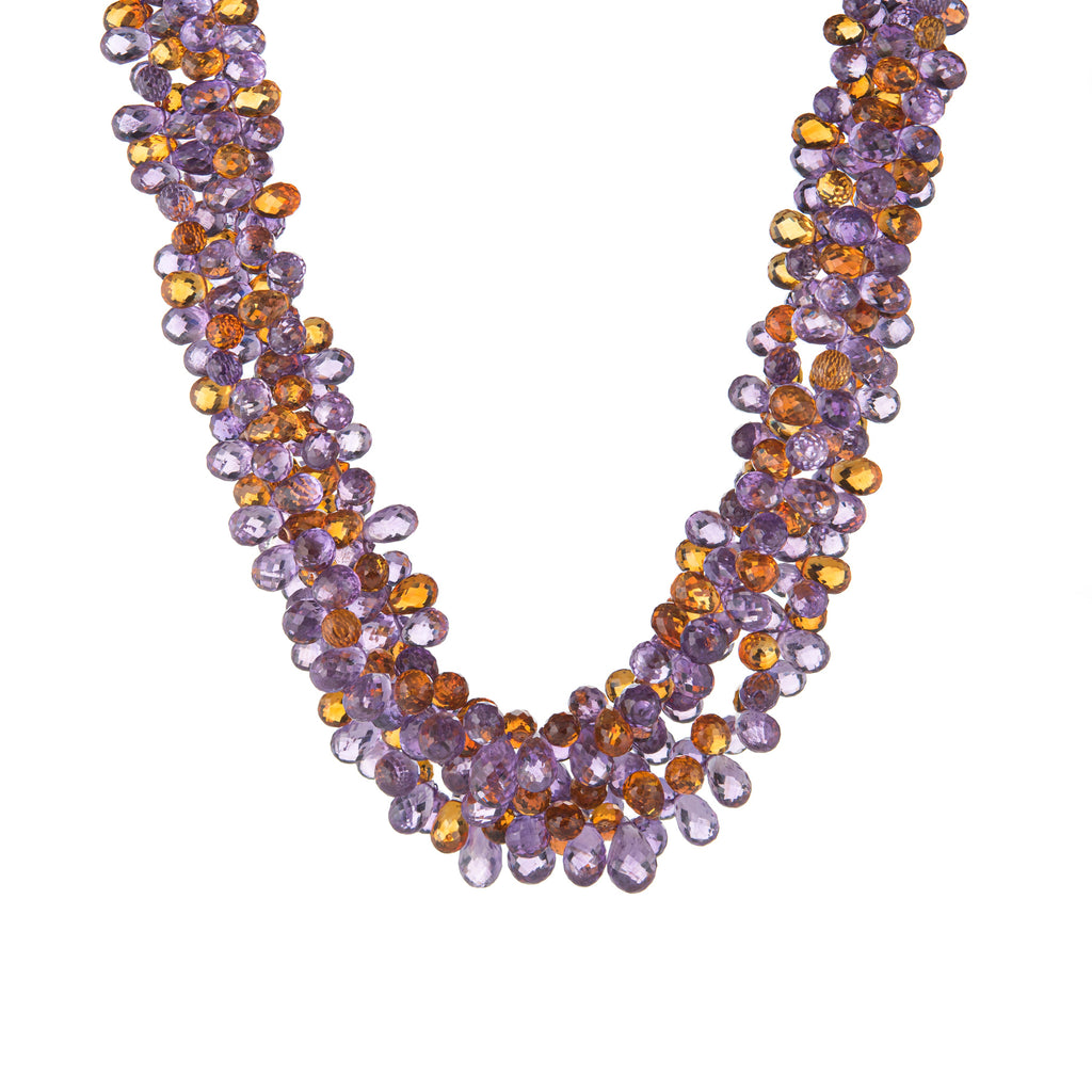 The necklace measures 17 inches in length and sits nicely at the nape of the necklace. The briolette cut allows maximum sparkle from the citrines and amethysts. The necklace makes a wonderful statement on its own with a great pop of color. Ideal for day or evening wear.