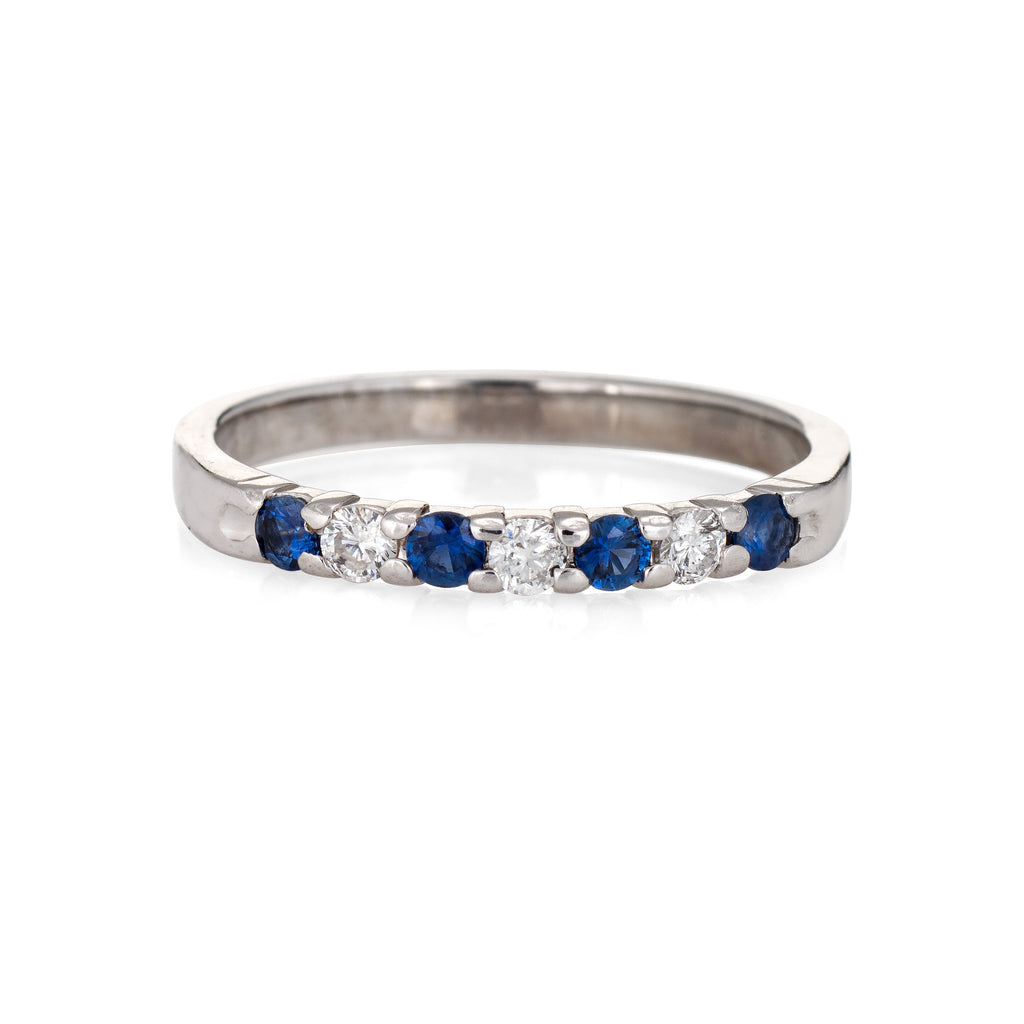 Stones: Three round brilliant cut diamonds total an estimated 0.06 carats (estimated at H-I color and SI2-I1 clarity). Four sapphires total an estimated 0.08 carats. The sapphires are in excellent condition and free of cracks or chips.