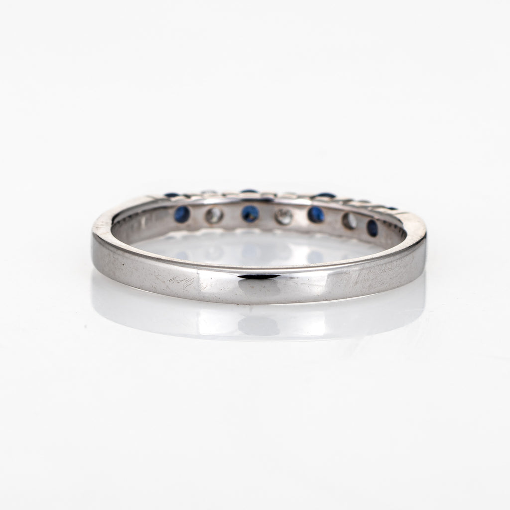 Three round brilliant cut diamonds total an estimated 0.06 carats (estimated at H-I color and SI2-I1 clarity). Four sapphires total an estimated 0.08 carats. The sapphires are in excellent condition and free of cracks or chips.