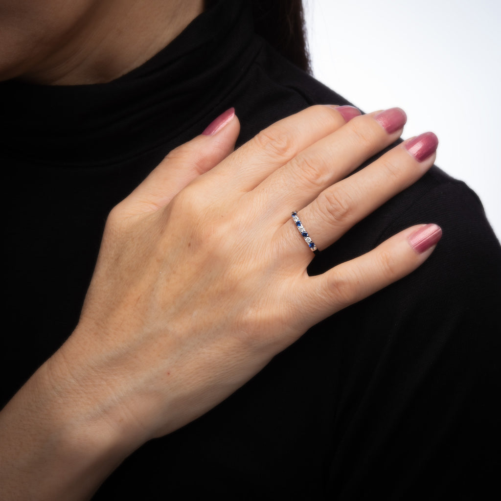 Stylish Kuber diamond & sapphire band crafted in 10 karat white gold.