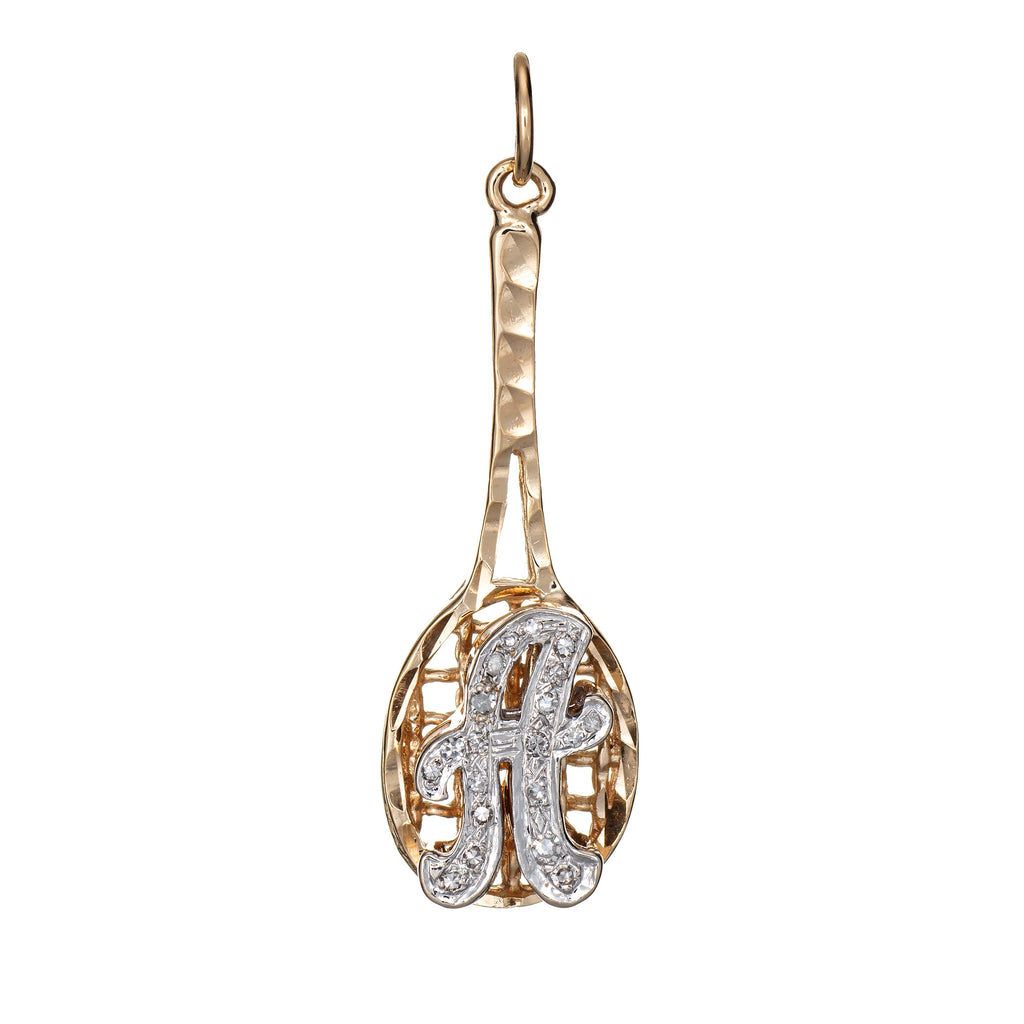 The nicely detailed vintage pendant (circa 1960s to 1970s) can be worn on a chain or as a charm on a bracelet. The letter "A" is formed in cursive letter and set upon a tennis racket.