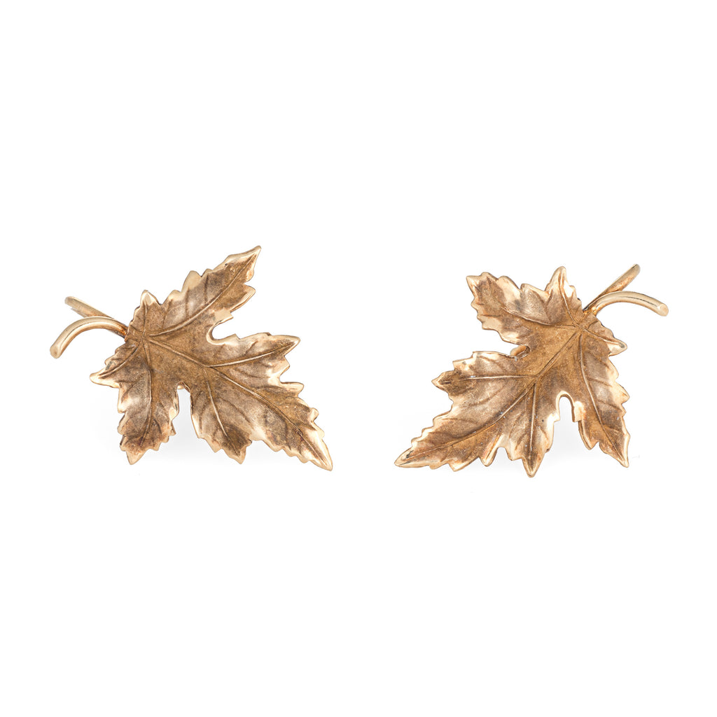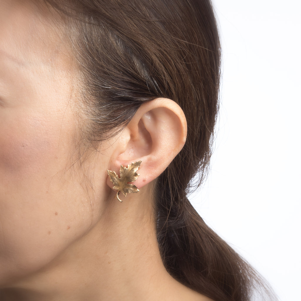 The charming maple leaf earrings are designed with lifelike details of veins to the leaves and a textured muted gold finish. Ideal for day or evening wear. The earrings are fitted with screw backings for pierced ears or non-pierced ears. The earrings can be converted to post and butterfly backings if desired.