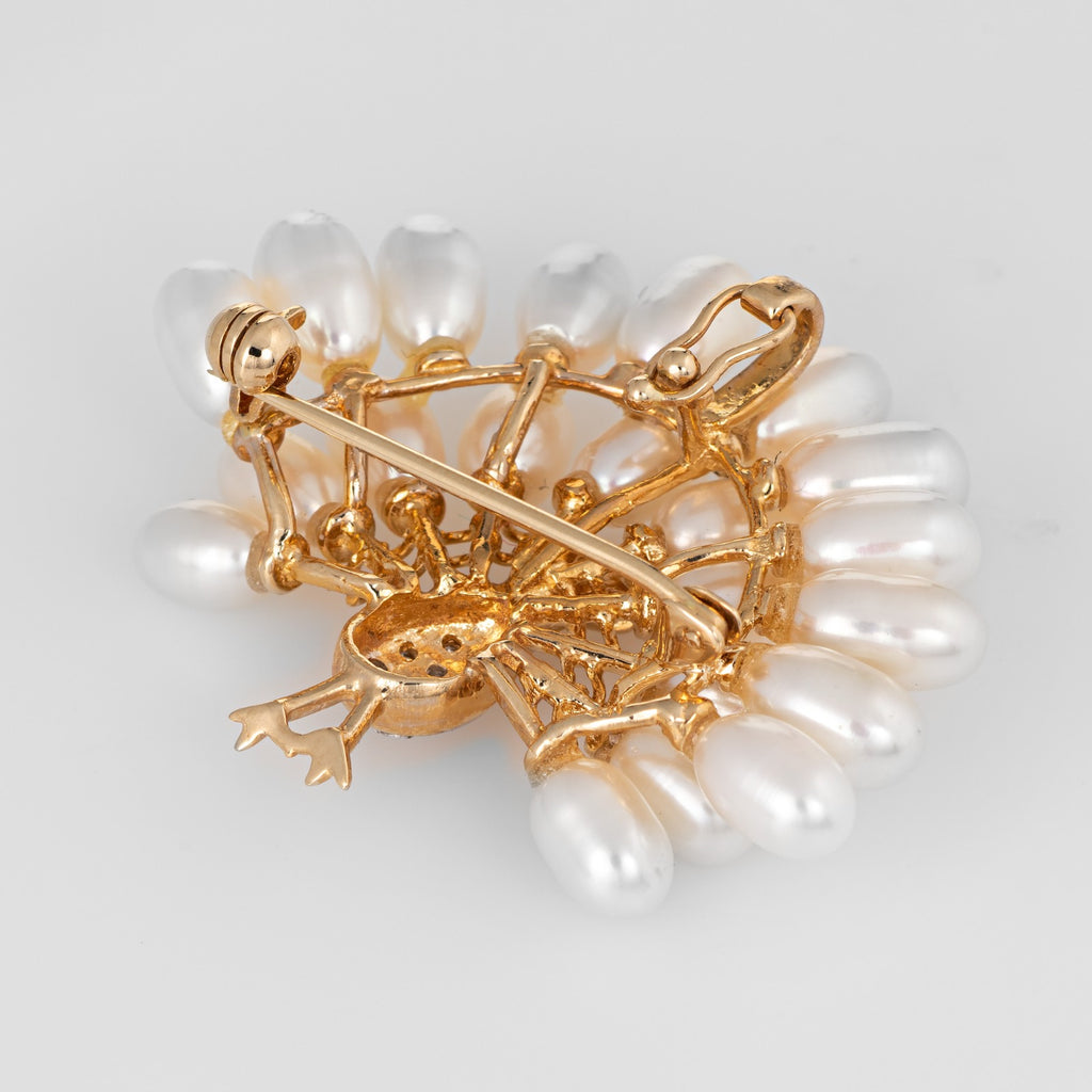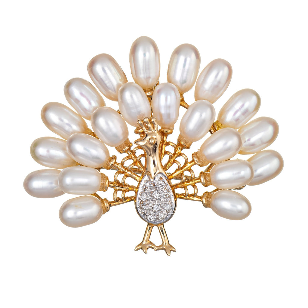 Peacock Pendant Brooch Diamond Freshwater Pearl Feathers 14k Gold Vintage Bird