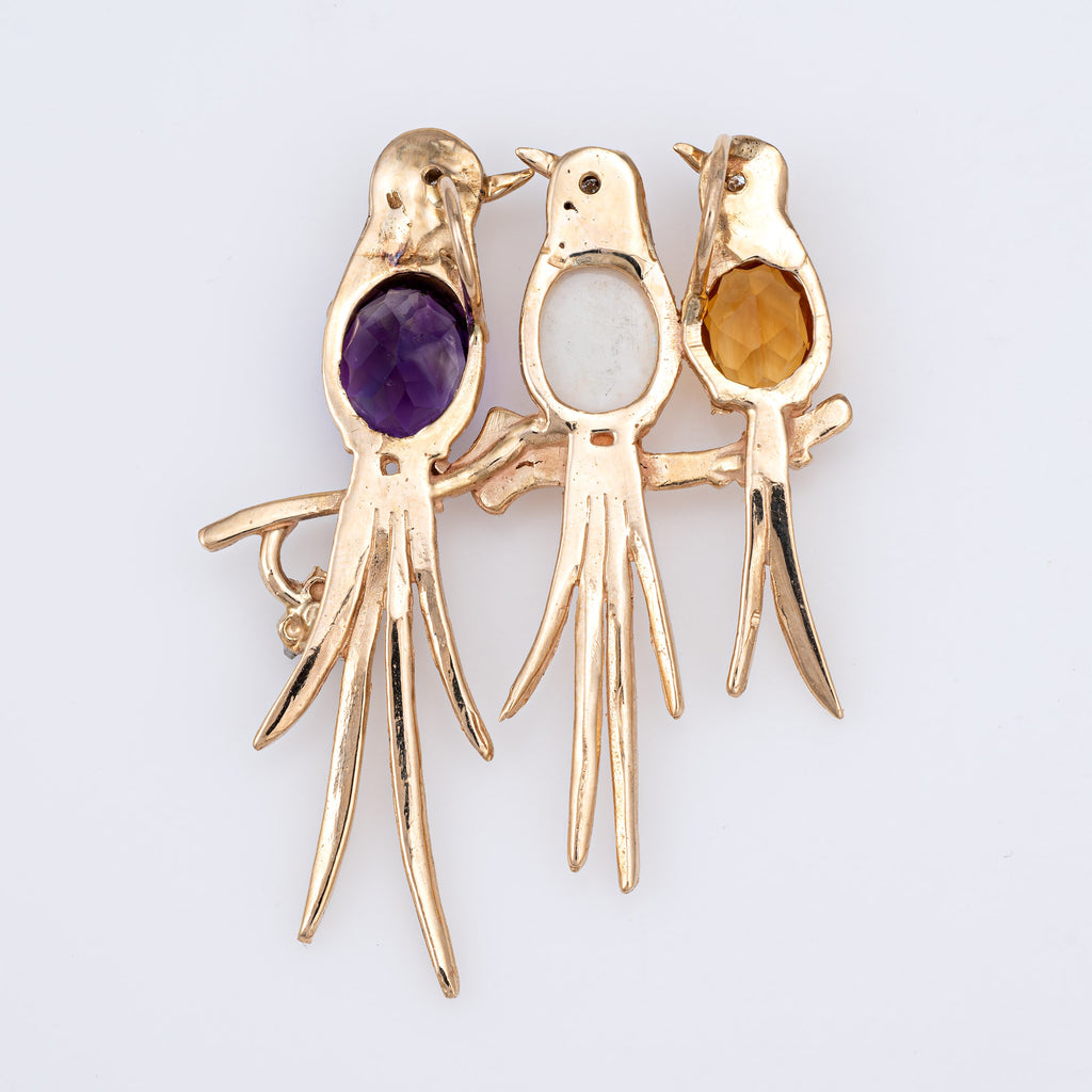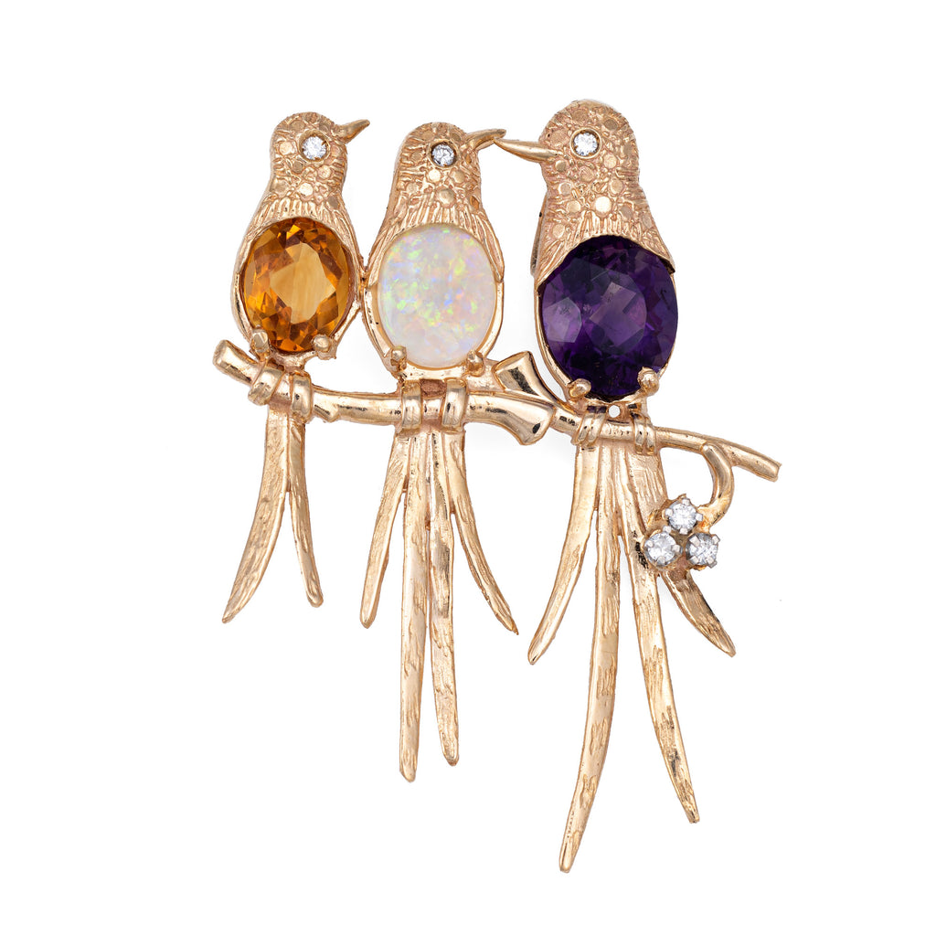 The pendant features three birds perched on a branch, set with a colorful array of gemstones (amethyst, opal and citrine) and long feathered tails. The back of the pendant features a double bale (measuring 5mm wide) and can accommodate a thin to medium thick chain. A great statement piece.