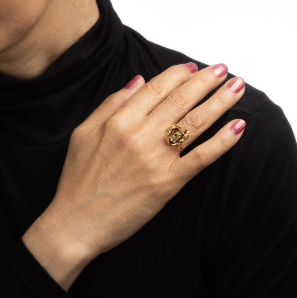 Metal & Hallmark: 14 karat yellow gold (ring) and 22k to 24k gold (nuggets). The ring is not hallmarked though it has tested positive for 14k gold. The nuggets have tested for 22k to 24k gold.
