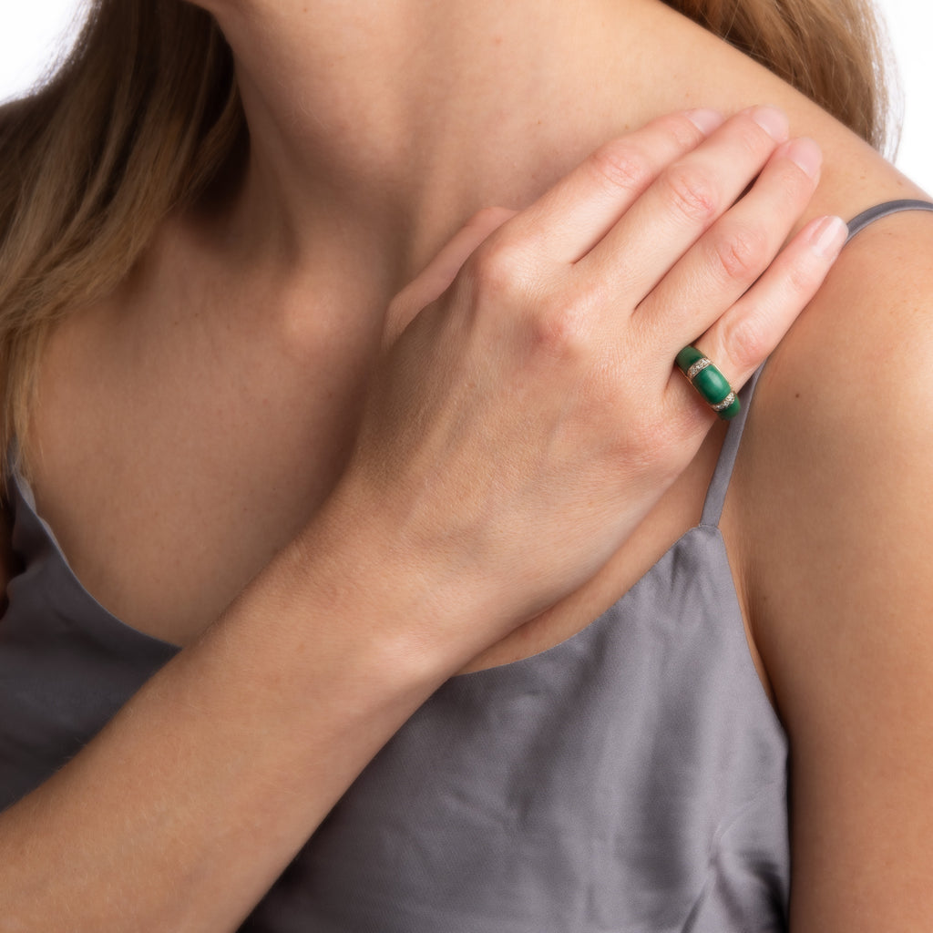 The domed ring, set with forest green malachite and diamond separators, makes a statement on the hand! The ring is great worn alone or stacked. The medium dome ring rises 7.5mm from the finger (0.29 inches).