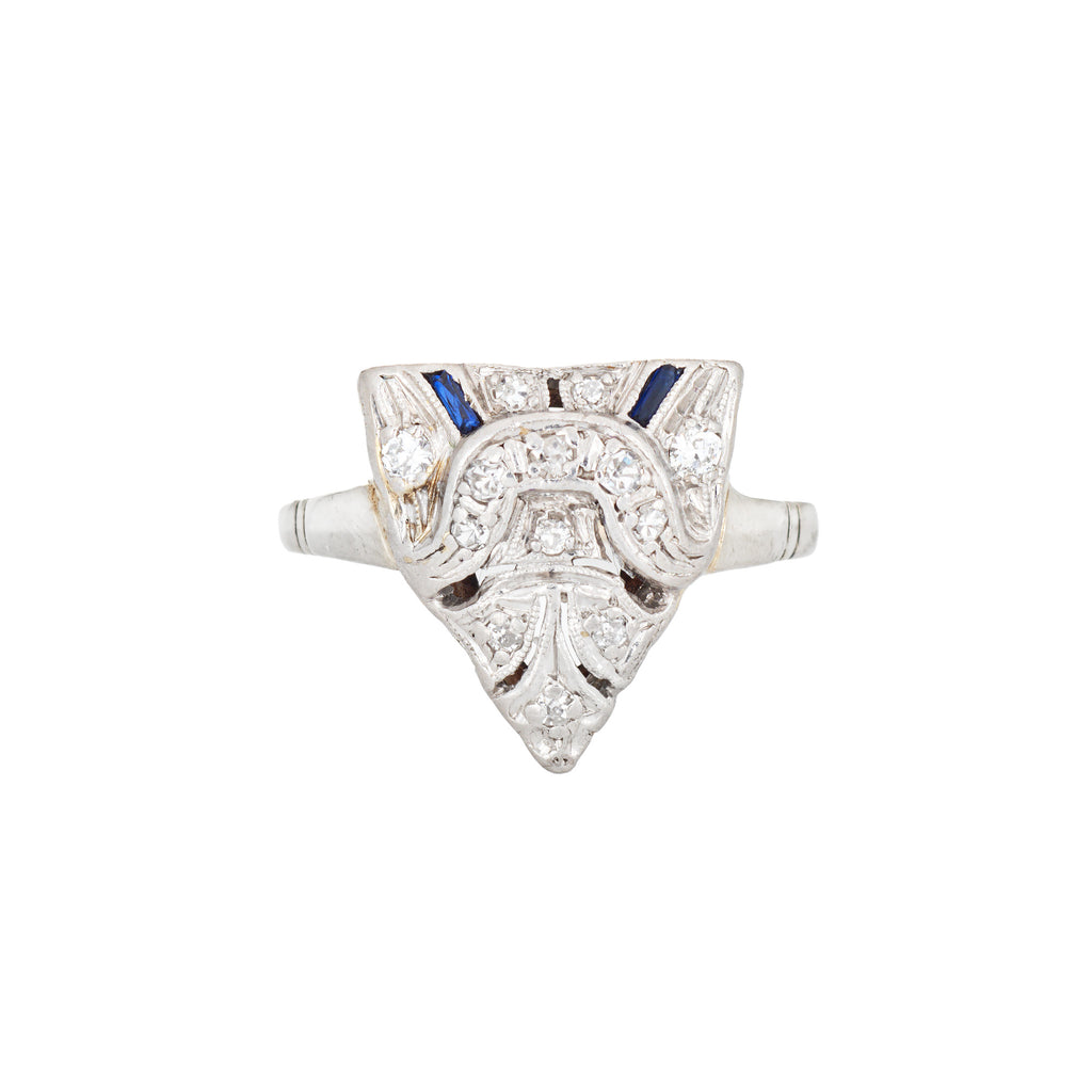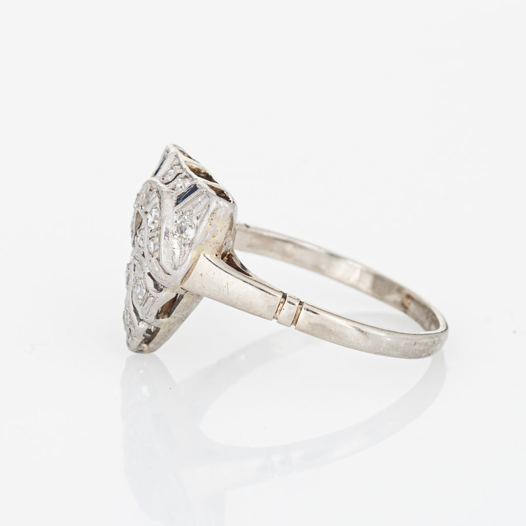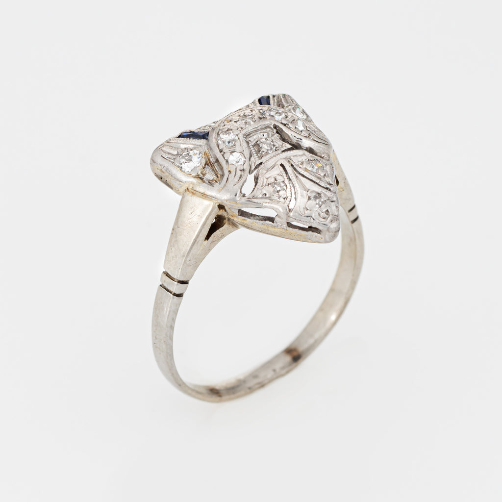 Finely detailed vintage Art Deco diamond & synthetic sapphire ring (circa 1920s to 1930s) crafted in 14k white gold.