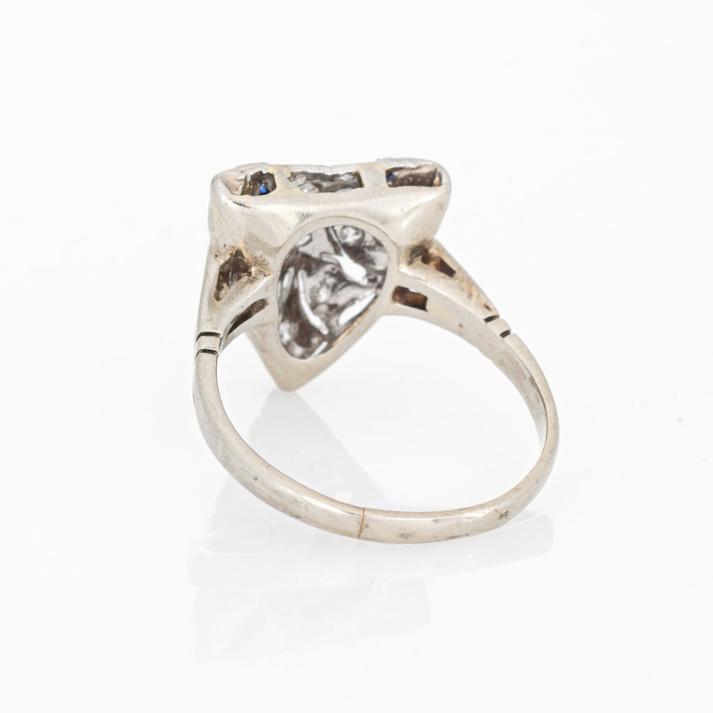 The stylish Art Deco era ring is triangular in design, set with small diamonds. The ring would make a lovely smaller cocktail ring or right hand ring for everyday wear. The ring has a lower profile and rises 5mm from the finger (0.19 inches).