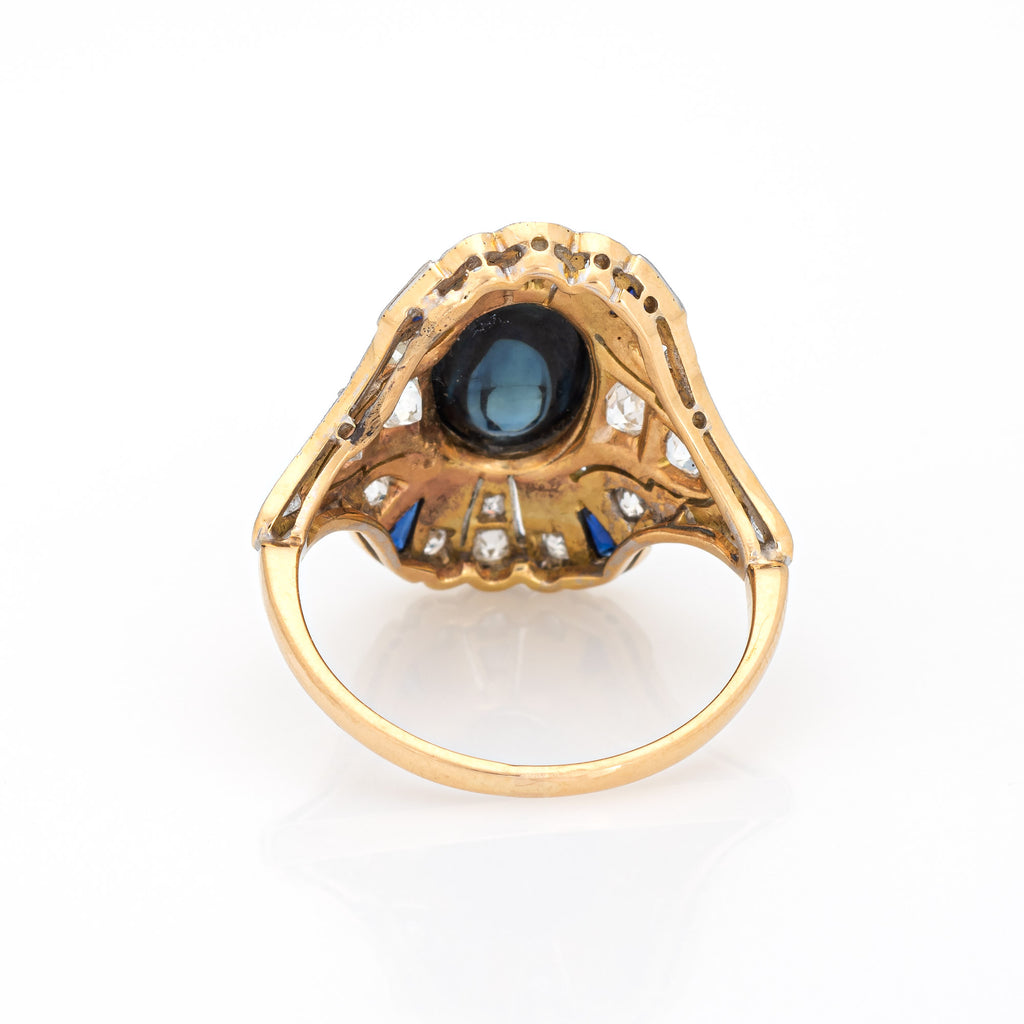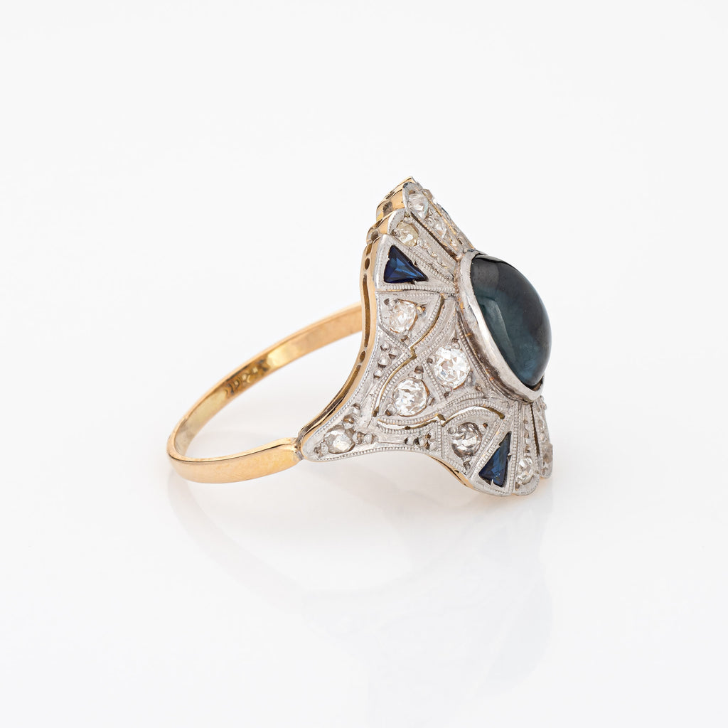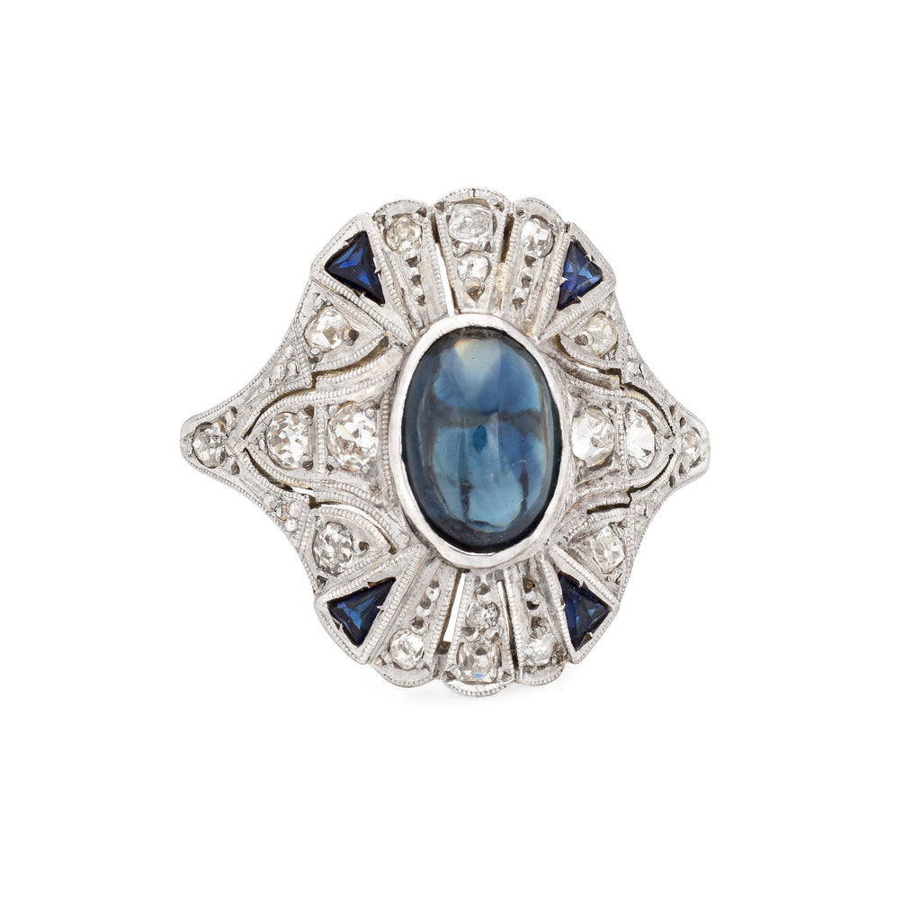 The beautiful center set natural cabochon sapphire shows hints of green and is bezel set into the elongated mount. The ring has a curved saddle with a low profile (rises 6.5mm from the finger). The ring makes a nice statement on the hand, ideal for wear as an alternative engagement ring or right hand ring for everyday wear. An Art Deco era classic!