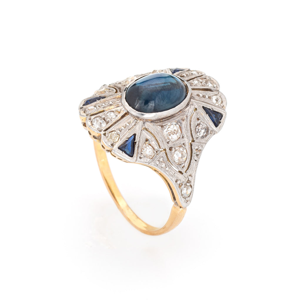 Stones: Cabochon cut natural star sapphire, 2.40ct (9.5 x 6.5 x 3.6mm), dark green-blue color, nearly flawless, good polish and symmetry, Australian origin, no evidence of treatments. Surrounding the center sapphire is four (4) 3mm x 2mm lab sapphires. Eighteen old rose cut & single diamonds total an estimated 0.50 carats (G-J color/VS-I1 clarity).