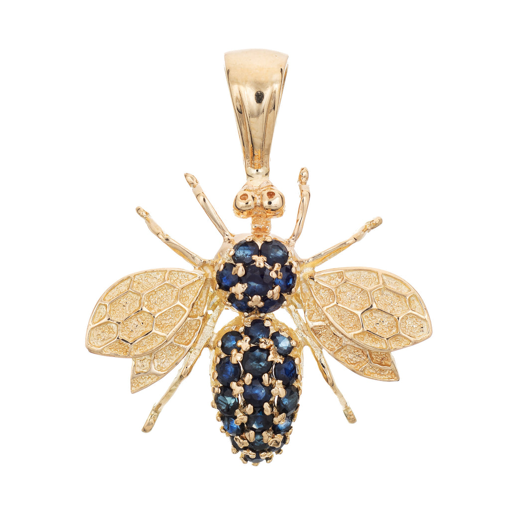 Finely detailed vintage sapphire bee pendant crafted in 14 karat yellow gold (circa 1980s to 1990s).