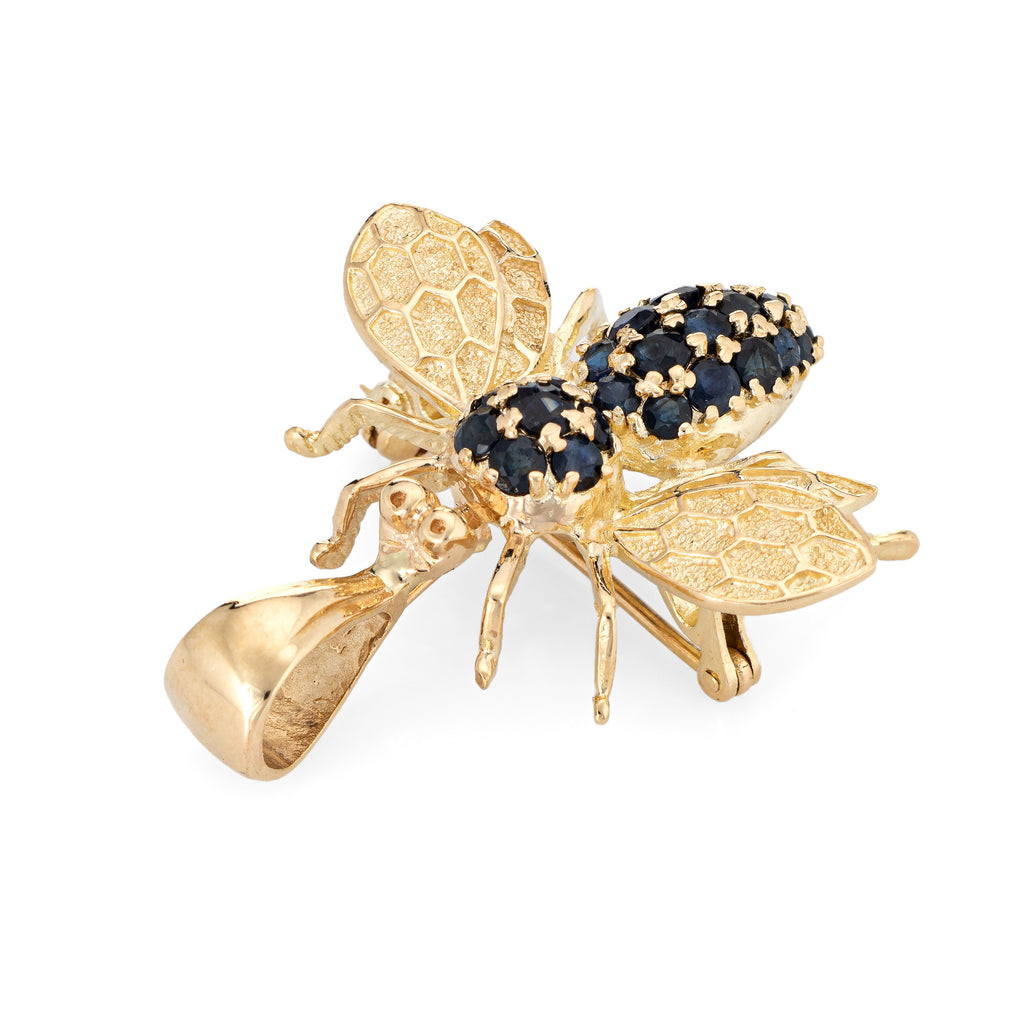 The nicely detailed bee is set with blue sapphires. The versatile piece can be worn as a pendant on a chain, or pinned for wear as a brooch. A great statement piece with a distinct design element.