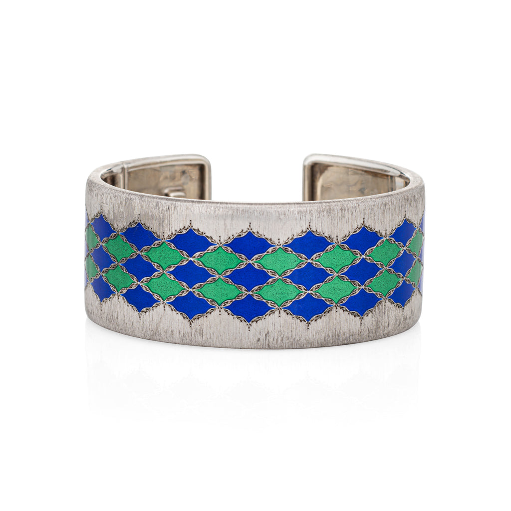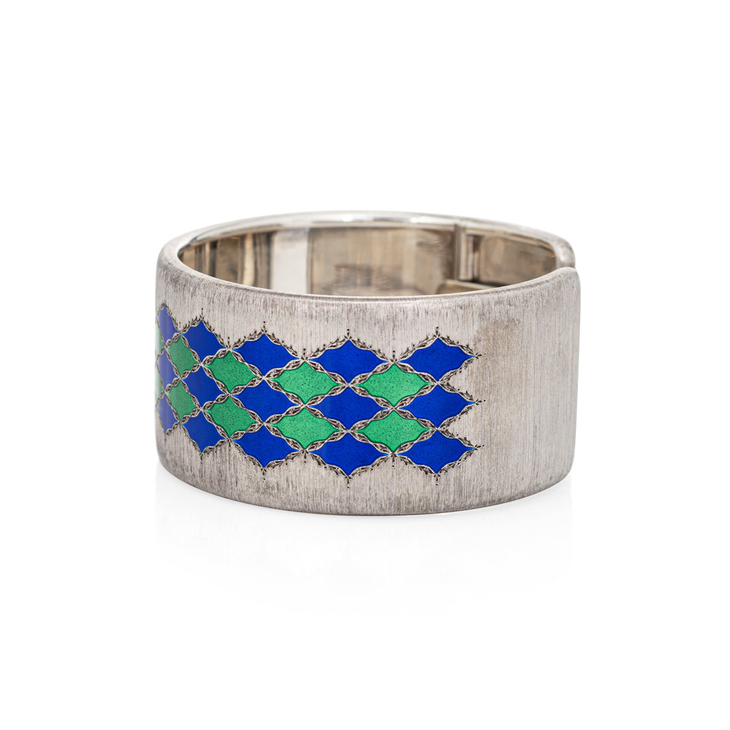 Vibrant blue and green enamel adorns the classic cuff within a renaissance style design motif. The intricate surface is silky to the touch along with a subtle sheen, a hallmark of Buccellati jewelry. Dating to the 1970s the cuff is a rare find and a great piece for the collector (and also very wearable!). The bracelet features a hinged opening clasp that allows the bracelet to easily slip on and off the wrist.