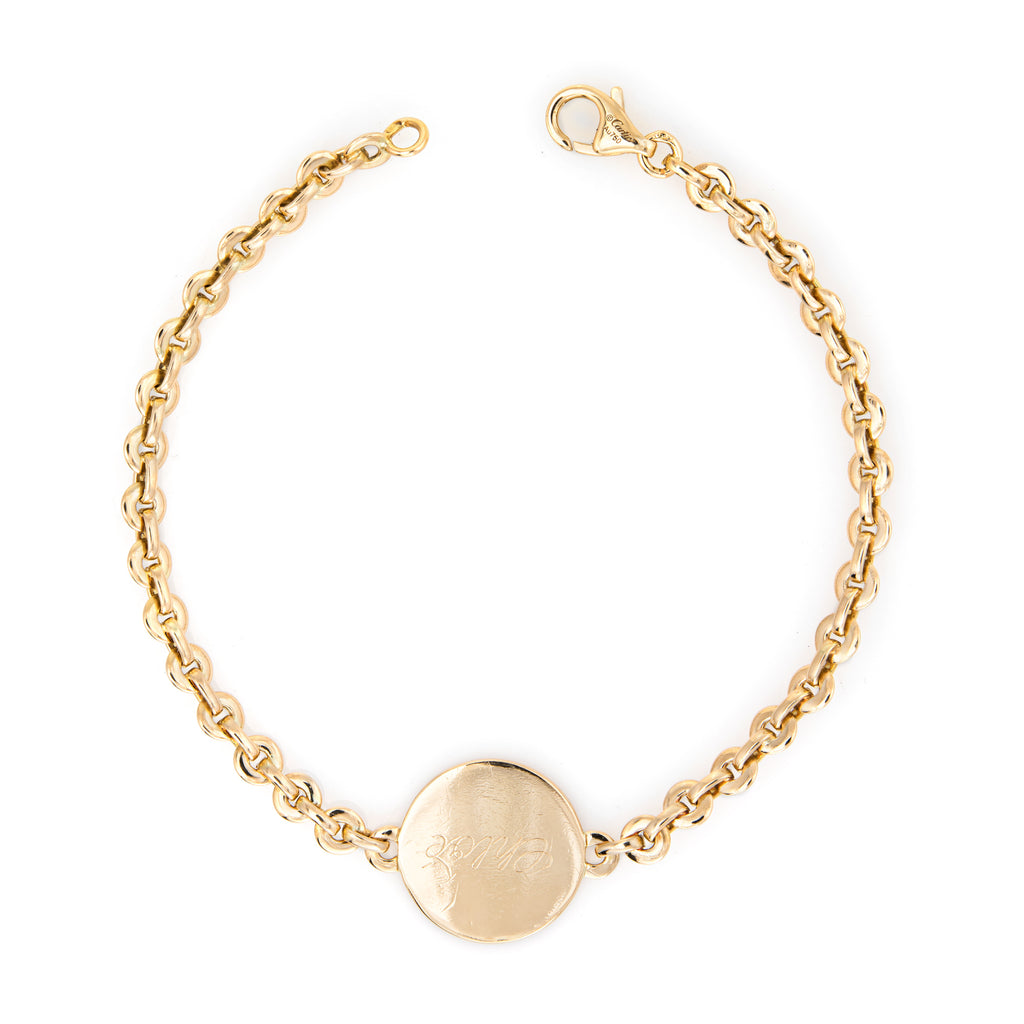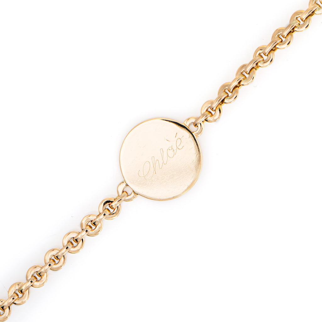 The round link bracelet terminates to a round ID medallion. It is engraved "Chloe" (can be removed if desired).