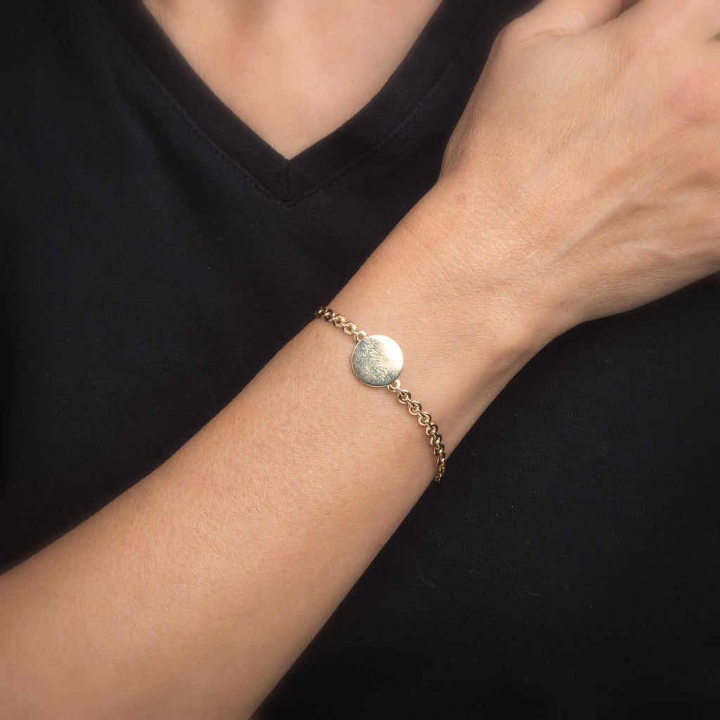 Size & Measurements: The bracelet measures 6 1/2 inches in length. The round medallion measures 14mm diameter (0.55 inches).