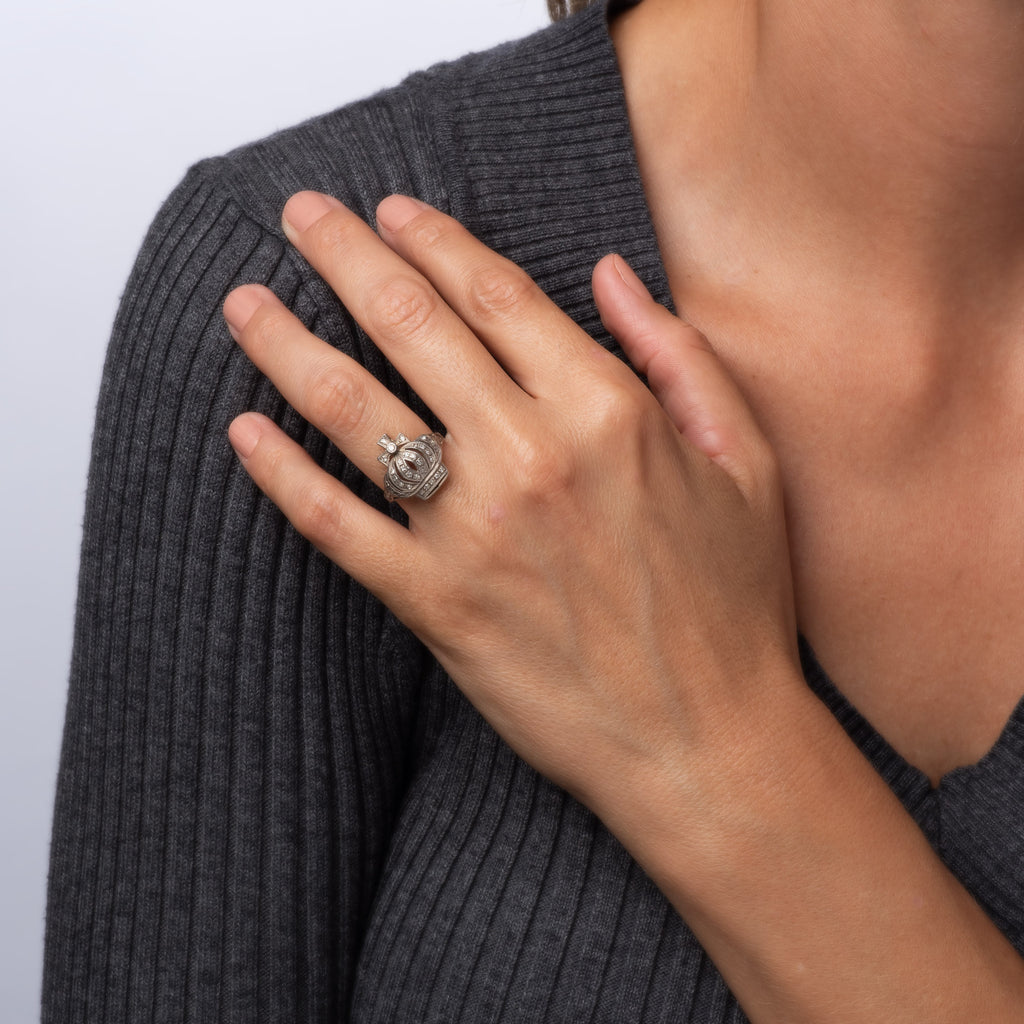 Designed as a crown and set with small sparkling diamonds, the cocktail ring makes a unique statement. The low rise ring (6mm - 0.23 inches) sits comfortably on the finger.